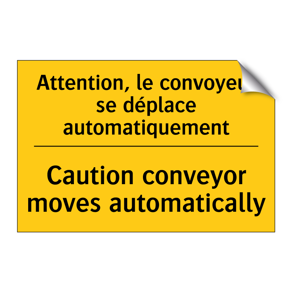 Panneau d'avertissement bilingue avec texte en français : "Attention, le convoyeur se déplace automatiquement", et en anglais : "Caution conveyor moves automatically"