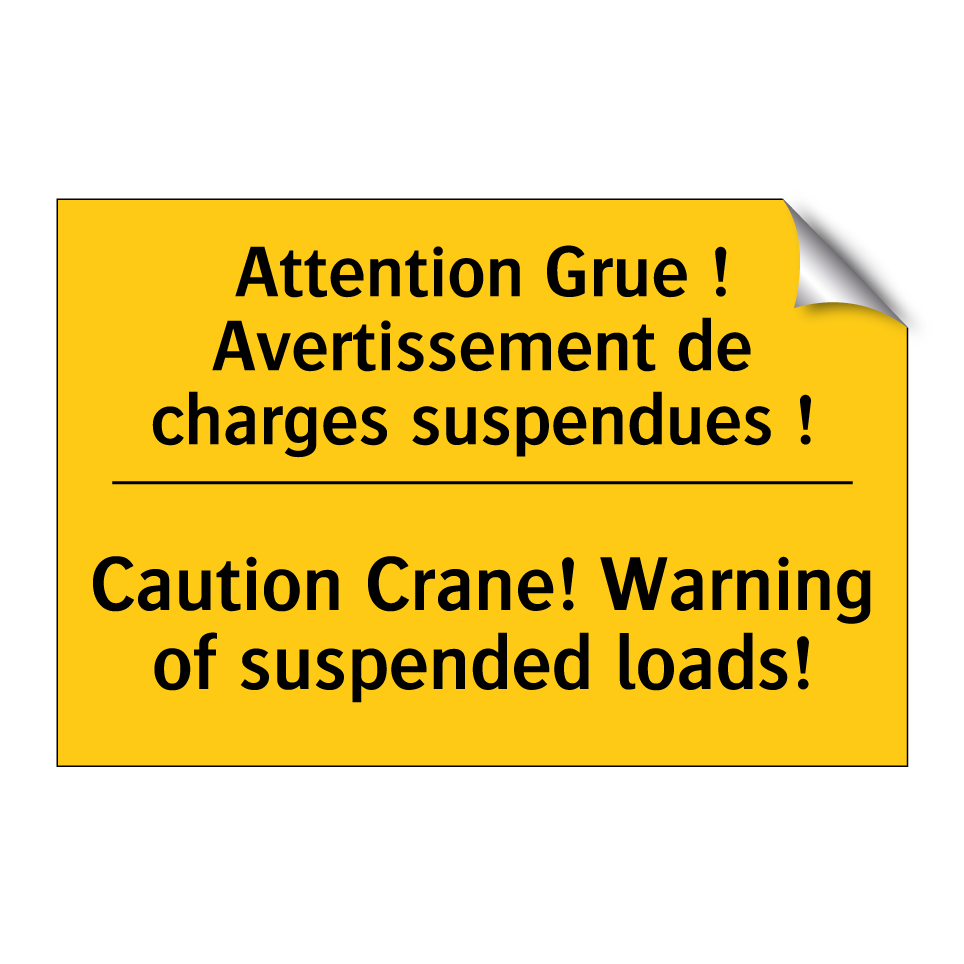 Panneau d'avertissement bilingue avec texte en français : "Attention Grue ! Avertissement de charges suspendues !", et en anglais : "Caution Crane! Warning of suspended loads!"