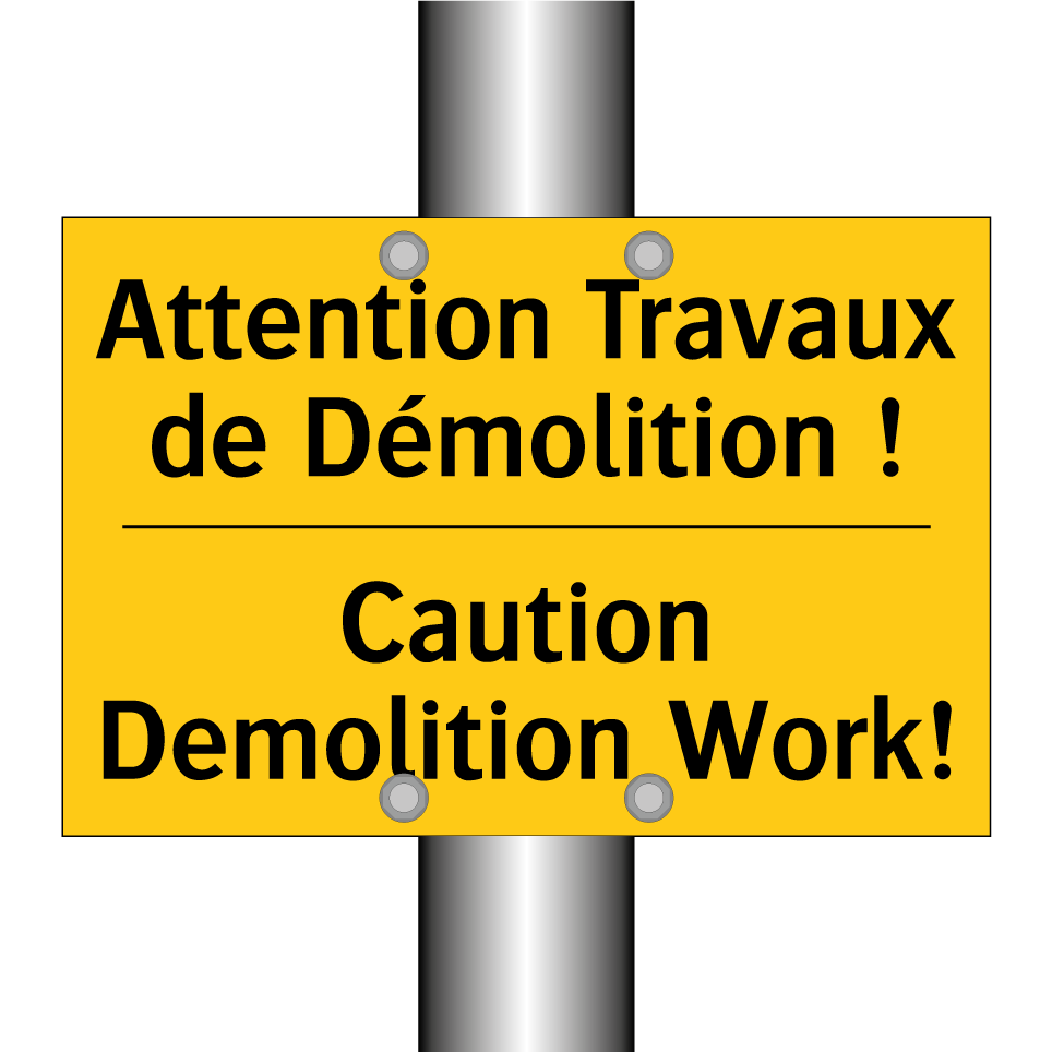 Panneau d'avertissement bilingue avec texte en français : "Attention Travaux de Démolition !", et en anglais : "Caution Demolition Work!"