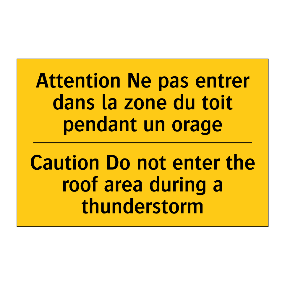 Panneau d'avertissement bilingue avec texte en français : "Attention Ne pas entrer dans la zone du toit pendant un orage", et en anglais : "Caution Do not enter the roof area during a thunderstorm"