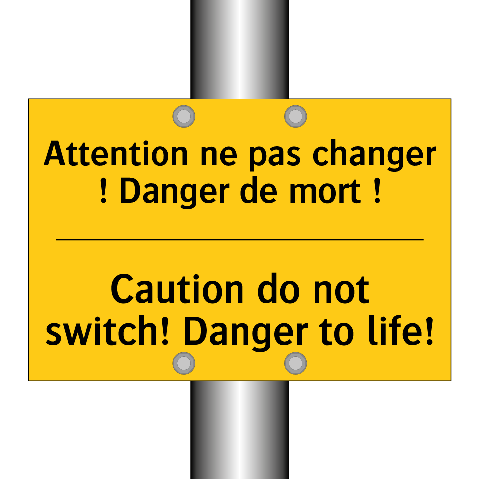 Panneau d'avertissement bilingue avec texte en français : "Attention ne pas changer ! Danger de mort !", et en anglais : "Caution do not switch! Danger to life!"