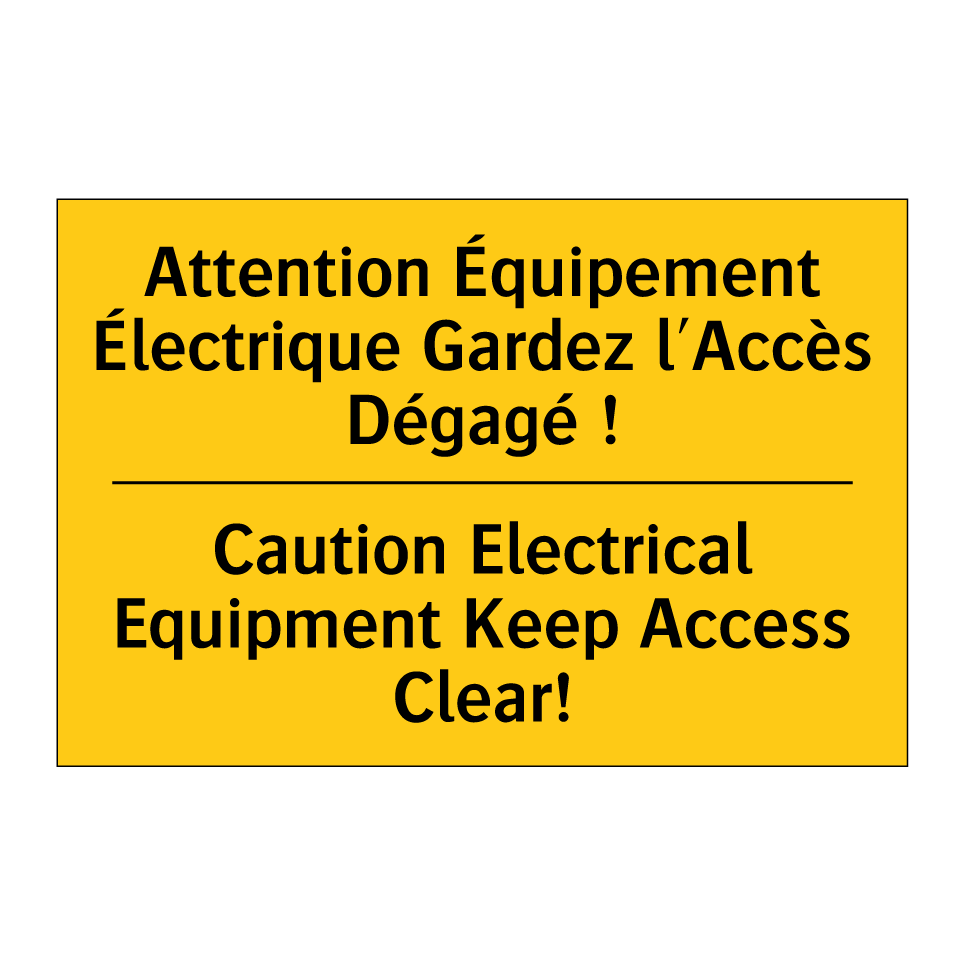 Panneau d'avertissement bilingue avec texte en français : "Attention Équipement Électrique Gardez l'Accès Dégagé !", et en anglais : "Caution Electrical Equipment Keep Access Clear!"