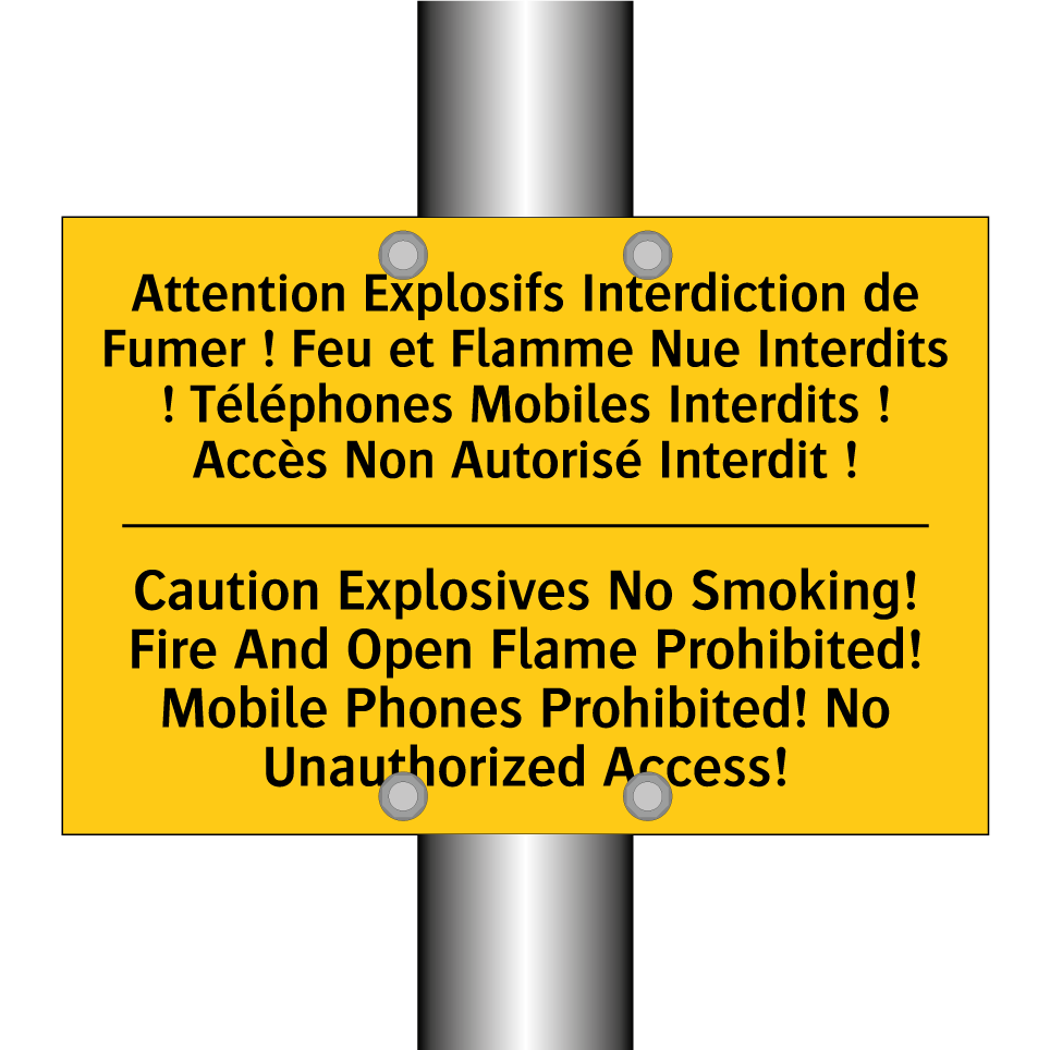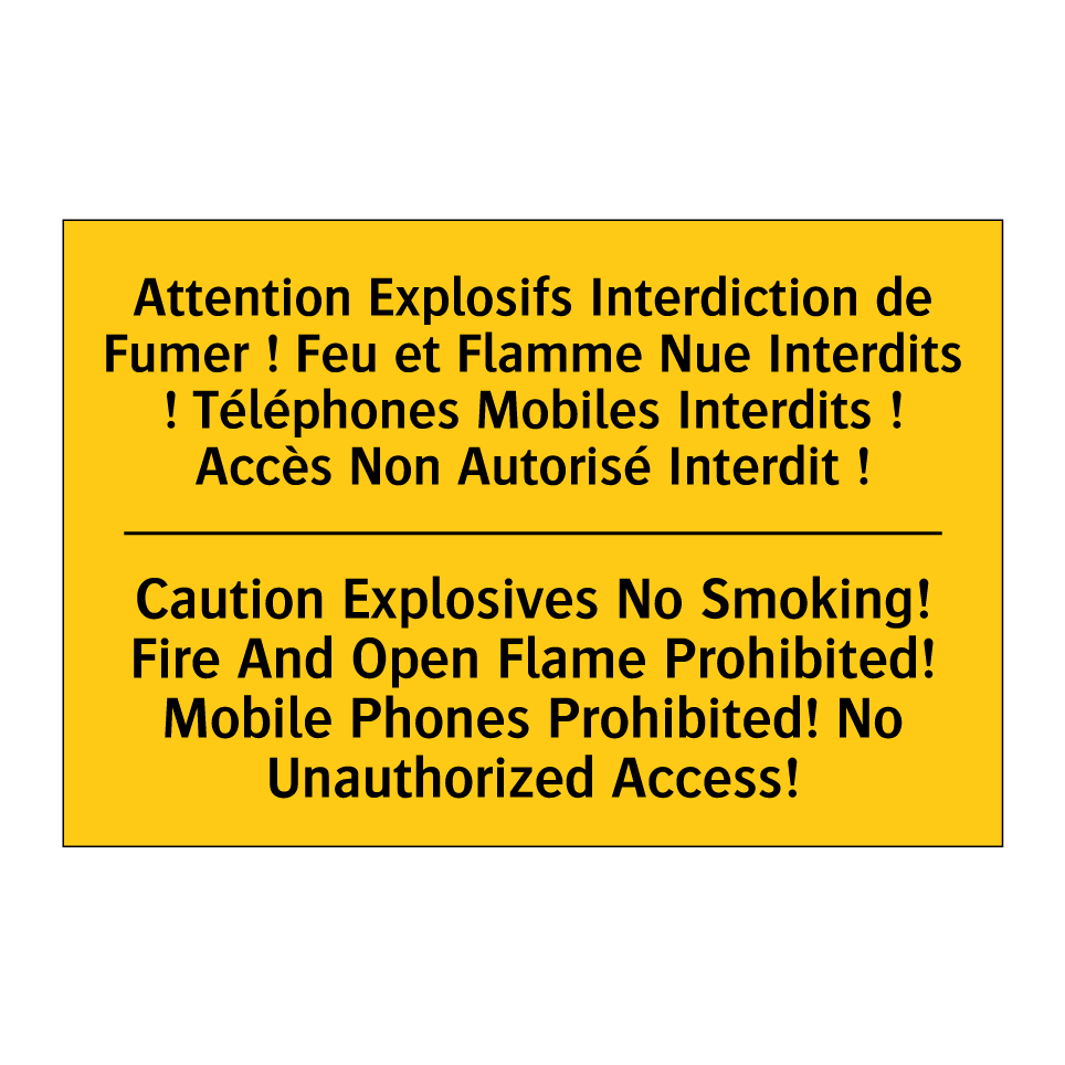 Panneau d'avertissement bilingue avec texte en français : "Attention Explosifs Interdiction de Fumer ! Feu et Flamme Nue Interdits ! Téléphones Mobiles Interdits ! Accès Non Autorisé Interdit !", et en anglais : "Caution Explosives No Smoking! Fire And Open Flame Prohibited! Mobile Phones Prohibited! No Unauthorized Access!"