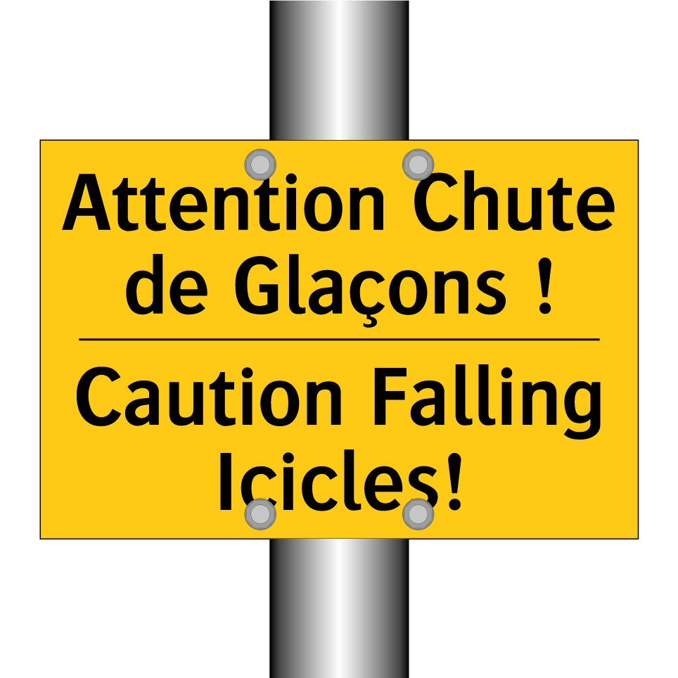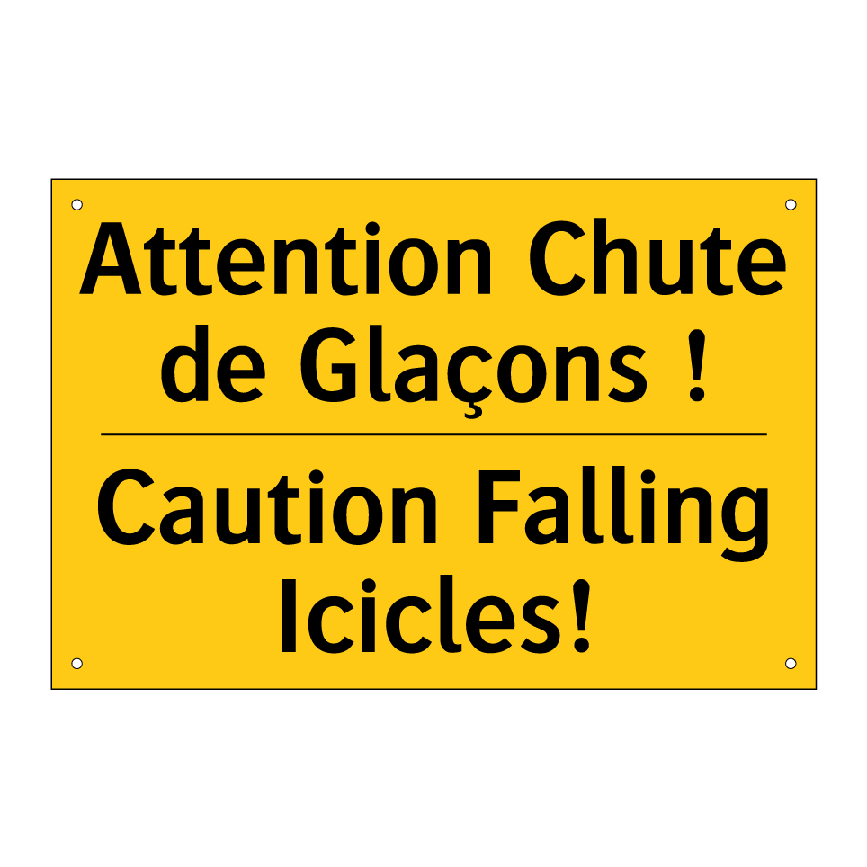 Panneau d'avertissement bilingue avec texte en français : "Attention Chute de Glaçons !", et en anglais : "Caution Falling Icicles!"