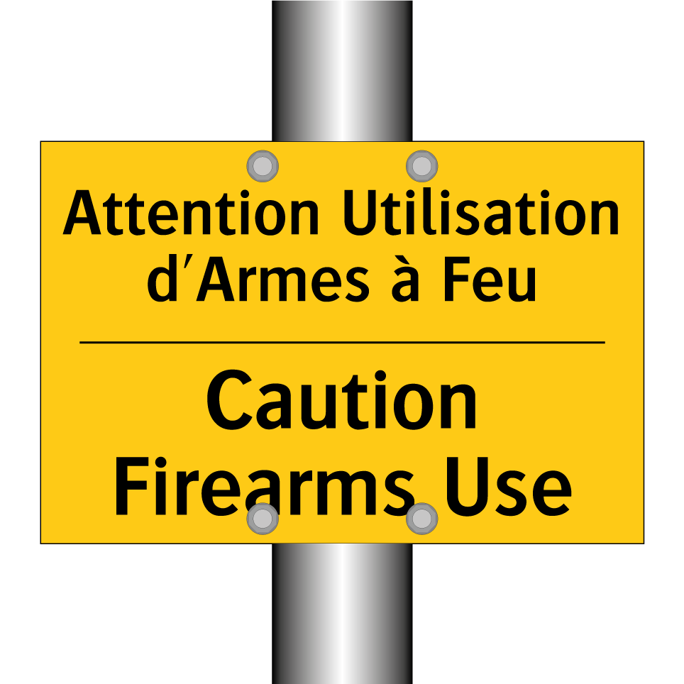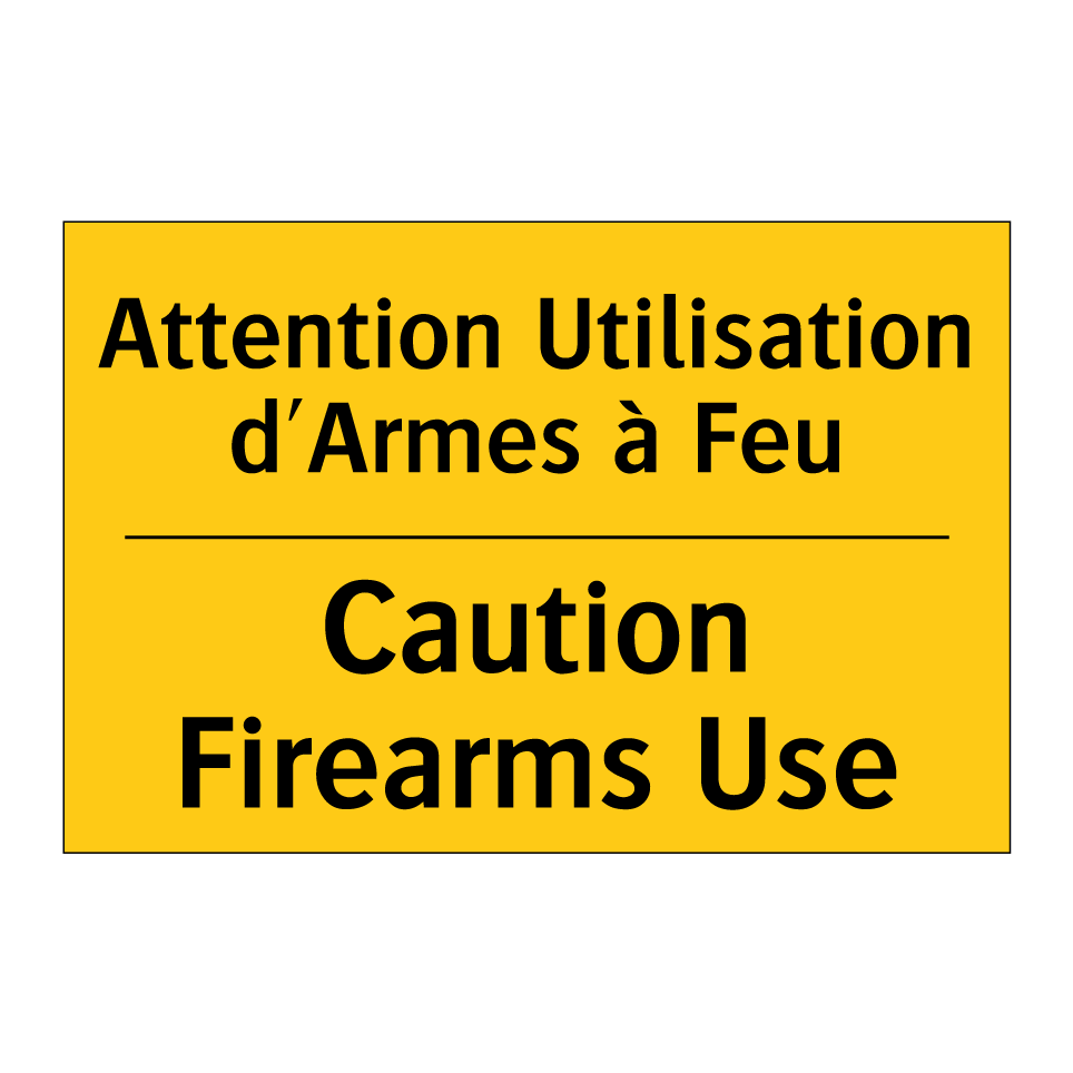 Panneau d'avertissement bilingue avec texte en français : "Attention Utilisation d'Armes à Feu", et en anglais : "Caution Firearms Use"
