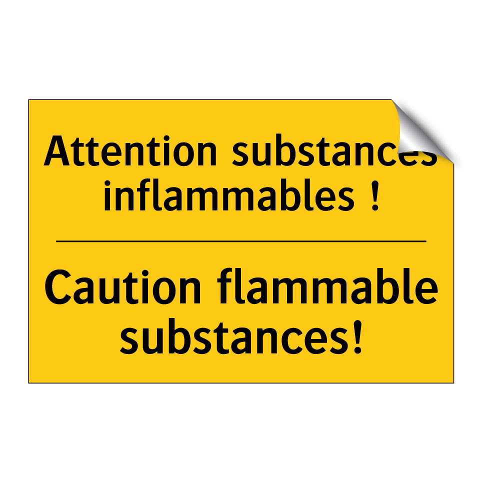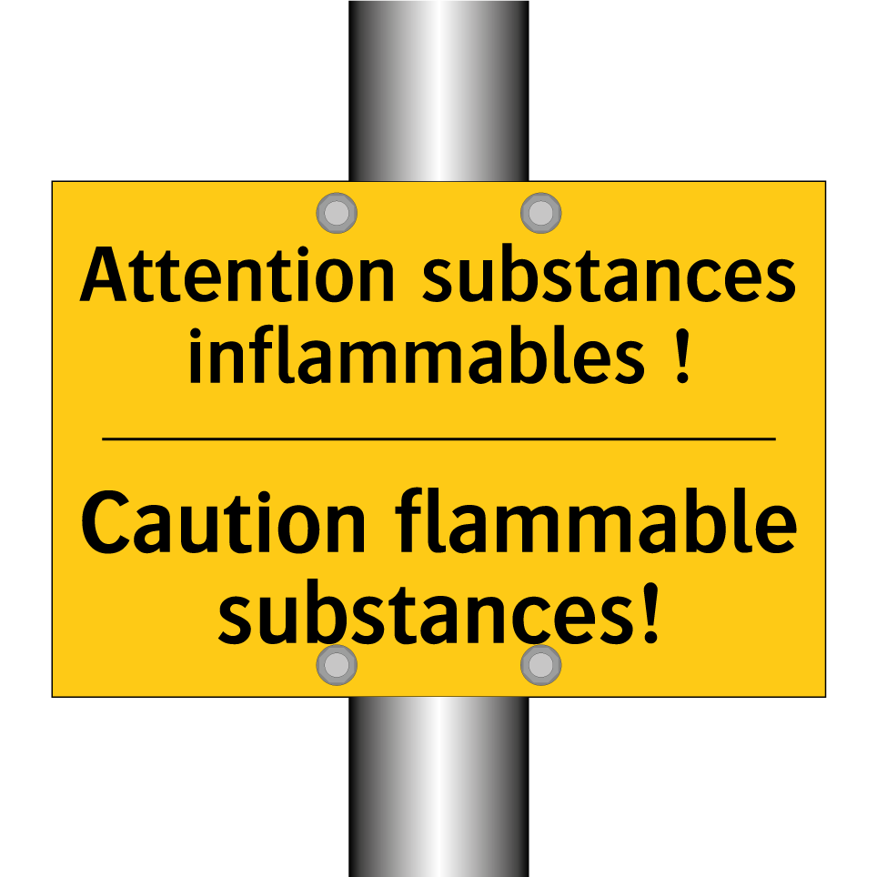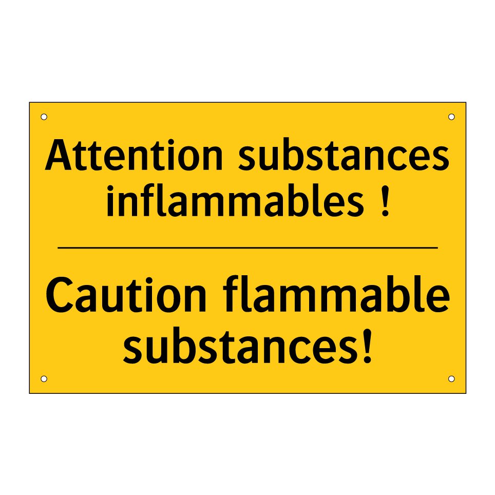 Panneau d'avertissement bilingue avec texte en français : "Attention substances inflammables !", et en anglais : "Caution flammable substances!"