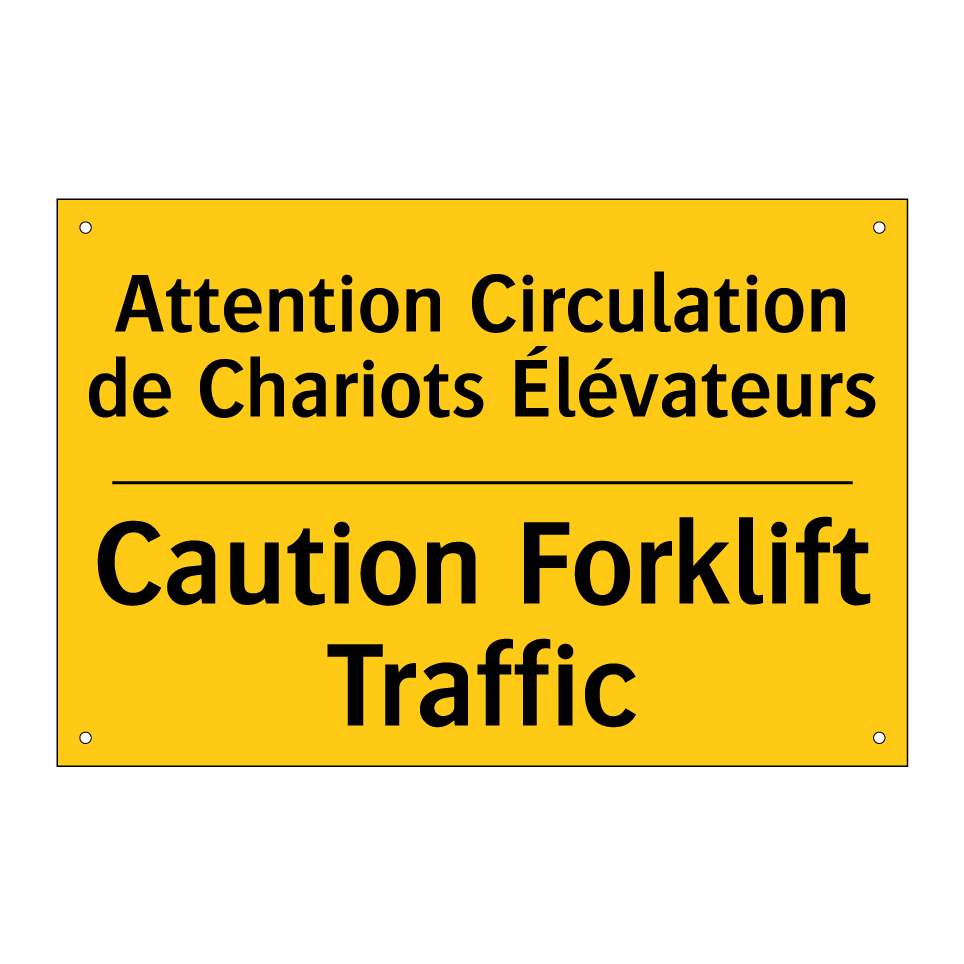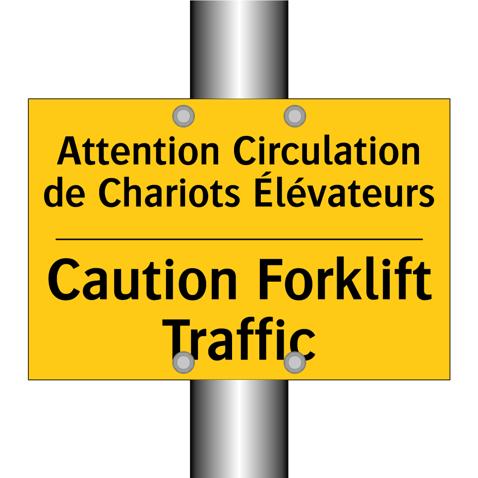 Panneau d'avertissement bilingue avec texte en français : "Attention Circulation de Chariots Élévateurs", et en anglais : "Caution Forklift Traffic"
