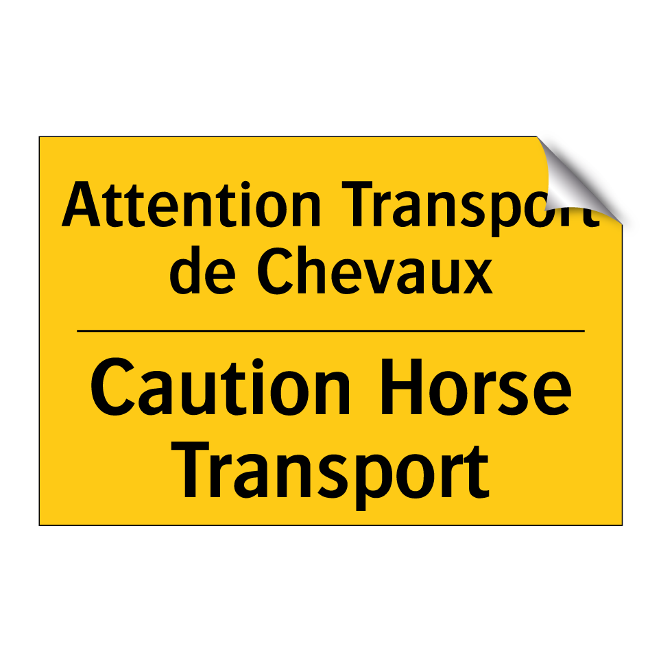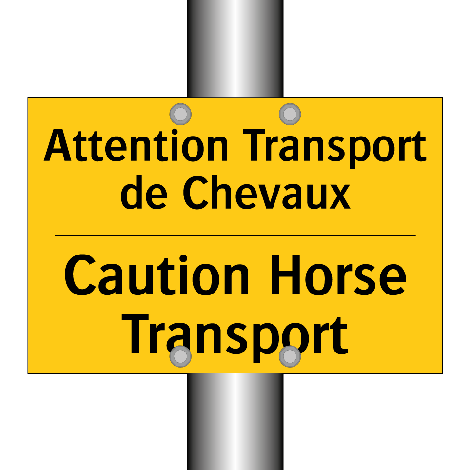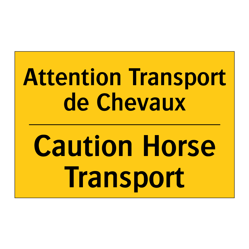 Panneau d'avertissement bilingue avec texte en français : "Attention Transport de Chevaux", et en anglais : "Caution Horse Transport"