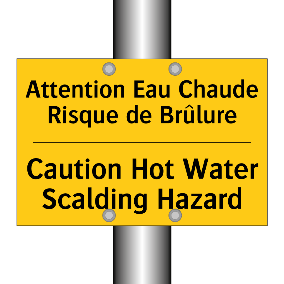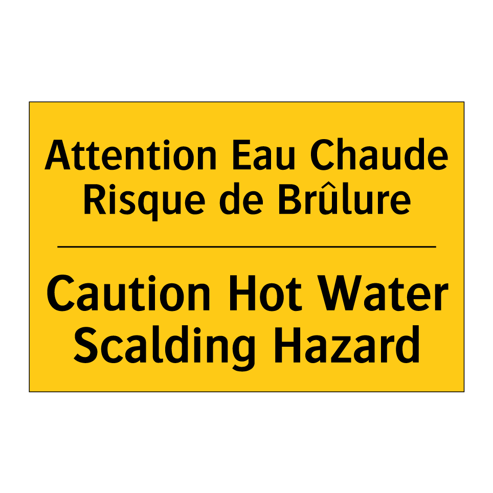 Panneau d'avertissement bilingue avec texte en français : "Attention Eau Chaude Risque de Brûlure", et en anglais : "Caution Hot Water Scalding Hazard"