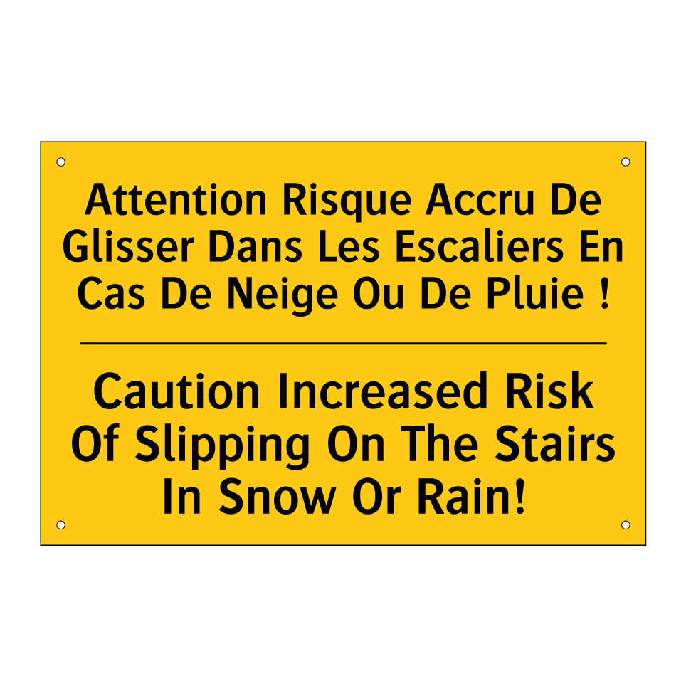 Panneau d'avertissement bilingue avec texte en français : "Attention Risque Accru De Glisser Dans Les Escaliers En Cas De Neige Ou De Pluie !", et en anglais : "Caution Increased Risk Of Slipping On The Stairs In Snow Or Rain!"