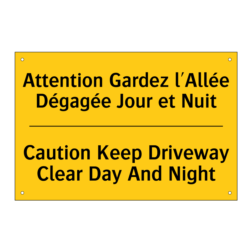 Panneau d'avertissement bilingue avec texte en français : "Attention Gardez l'Allée Dégagée Jour et Nuit", et en anglais : "Caution Keep Driveway Clear Day And Night"
