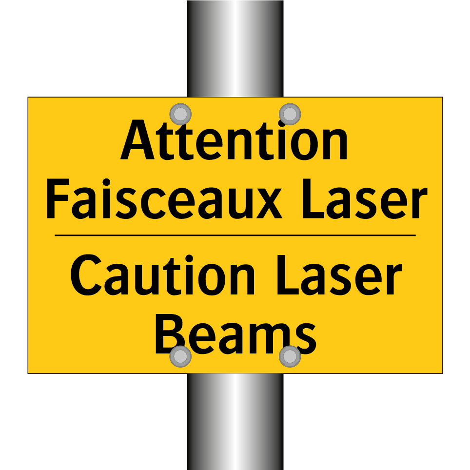 Panneau d'avertissement bilingue avec texte en français : "Attention Faisceaux Laser", et en anglais : "Caution Laser Beams"