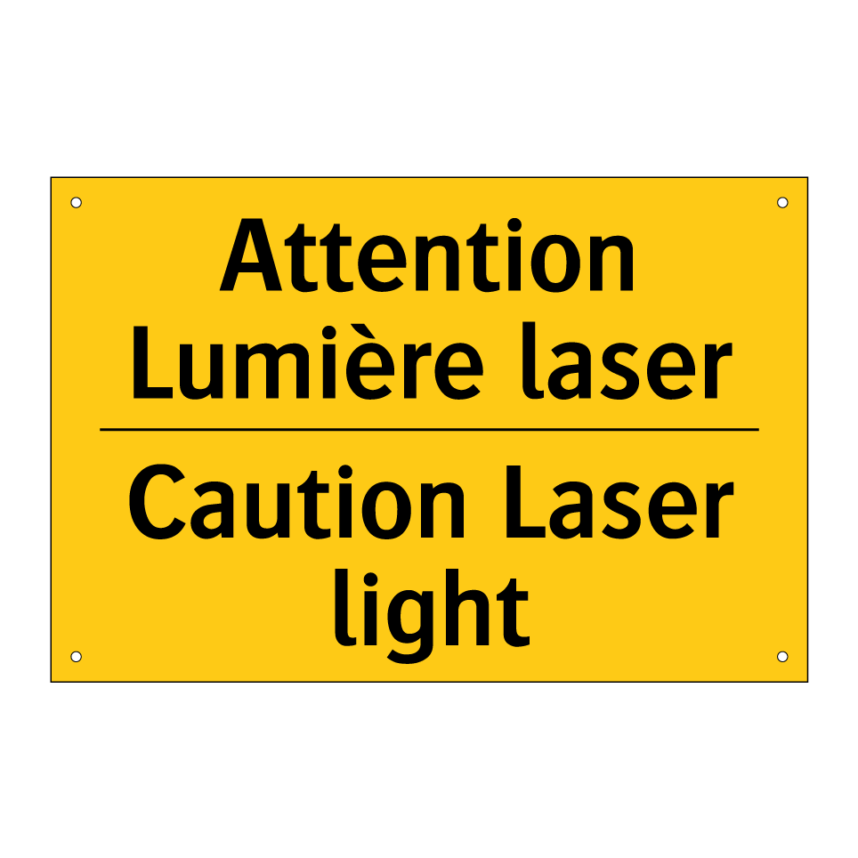 Panneau d'avertissement bilingue avec texte en français : "Attention Lumière laser", et en anglais : "Caution Laser light"