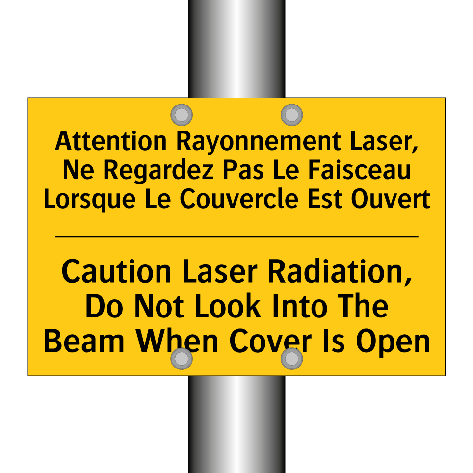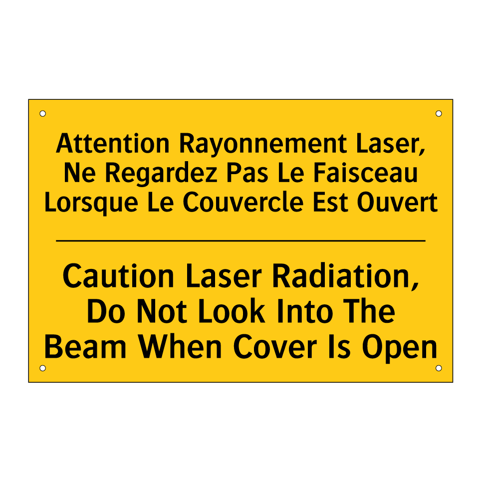 Panneau d'avertissement bilingue avec texte en français : "Attention Rayonnement Laser, Ne Regardez Pas Le Faisceau Lorsque Le Couvercle Est Ouvert", et en anglais : "Caution Laser Radiation, Do Not Look Into The Beam When Cover Is Open"