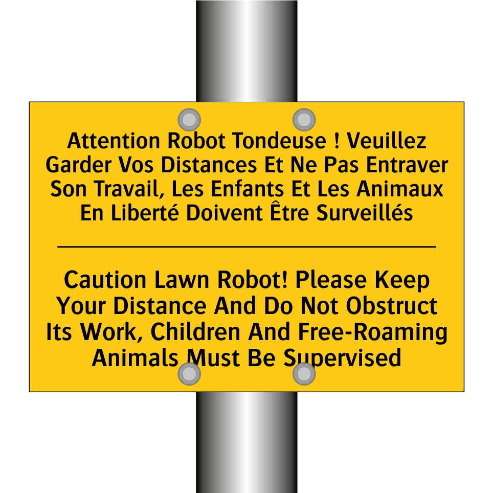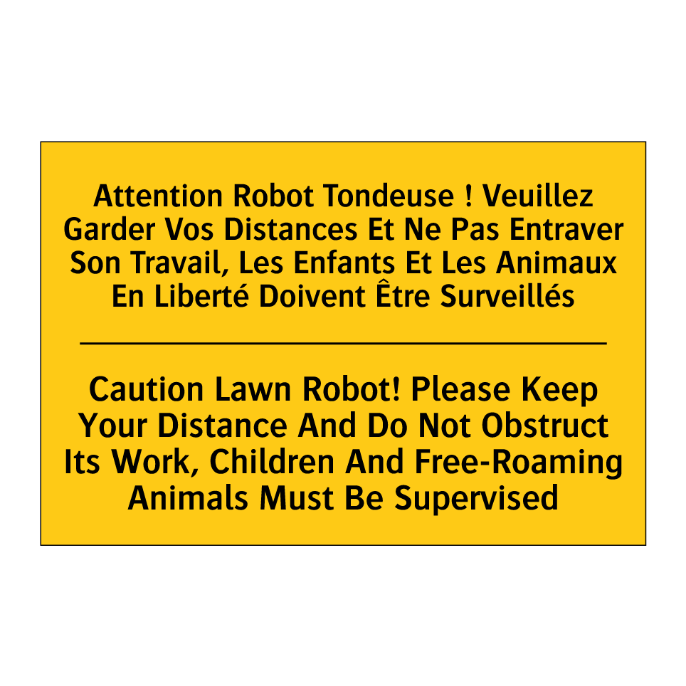 Panneau d'avertissement bilingue avec texte en français : "Attention Robot Tondeuse ! Veuillez Garder Vos Distances Et Ne Pas Entraver Son Travail, Les Enfants Et Les Animaux En Liberté Doivent Être Surveillés", et en anglais : "Caution Lawn Robot! Please Keep Your Distance And Do Not Obstruct Its Work, Children And Free-Roaming Animals Must Be Supervised"