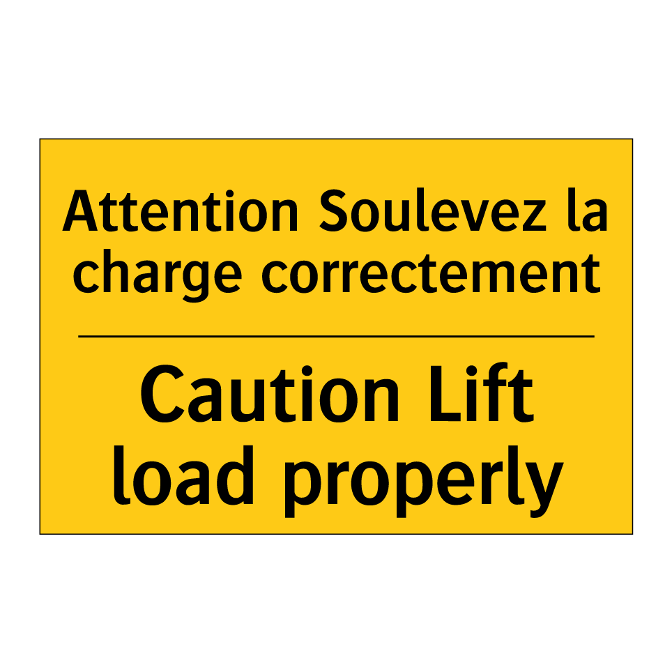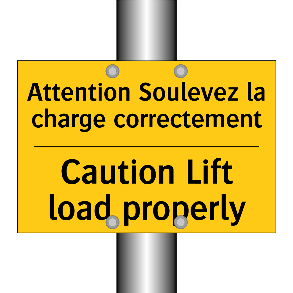 Panneau d'avertissement bilingue avec texte en français : "Attention Soulevez la charge correctement", et en anglais : "Caution Lift load properly"