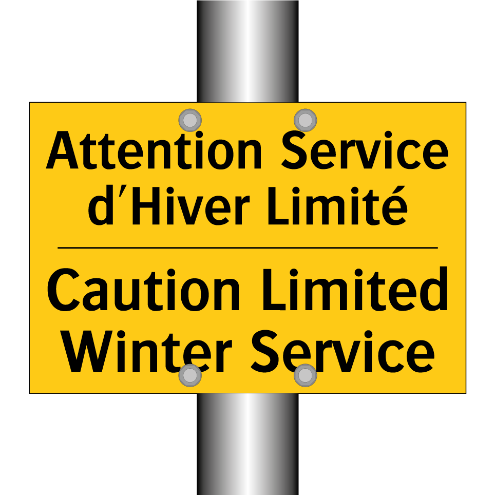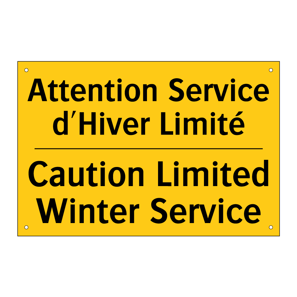 Panneau d'avertissement bilingue avec texte en français : "Attention Service d'Hiver Limité", et en anglais : "Caution Limited Winter Service"