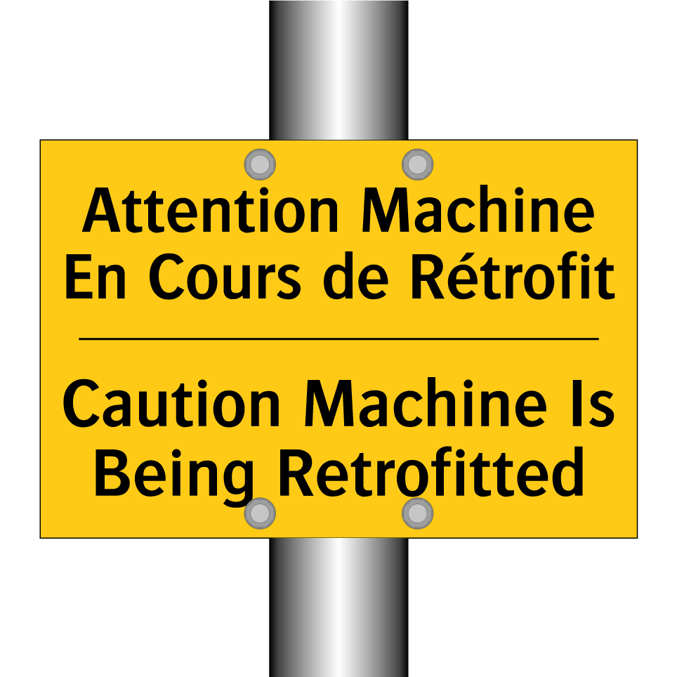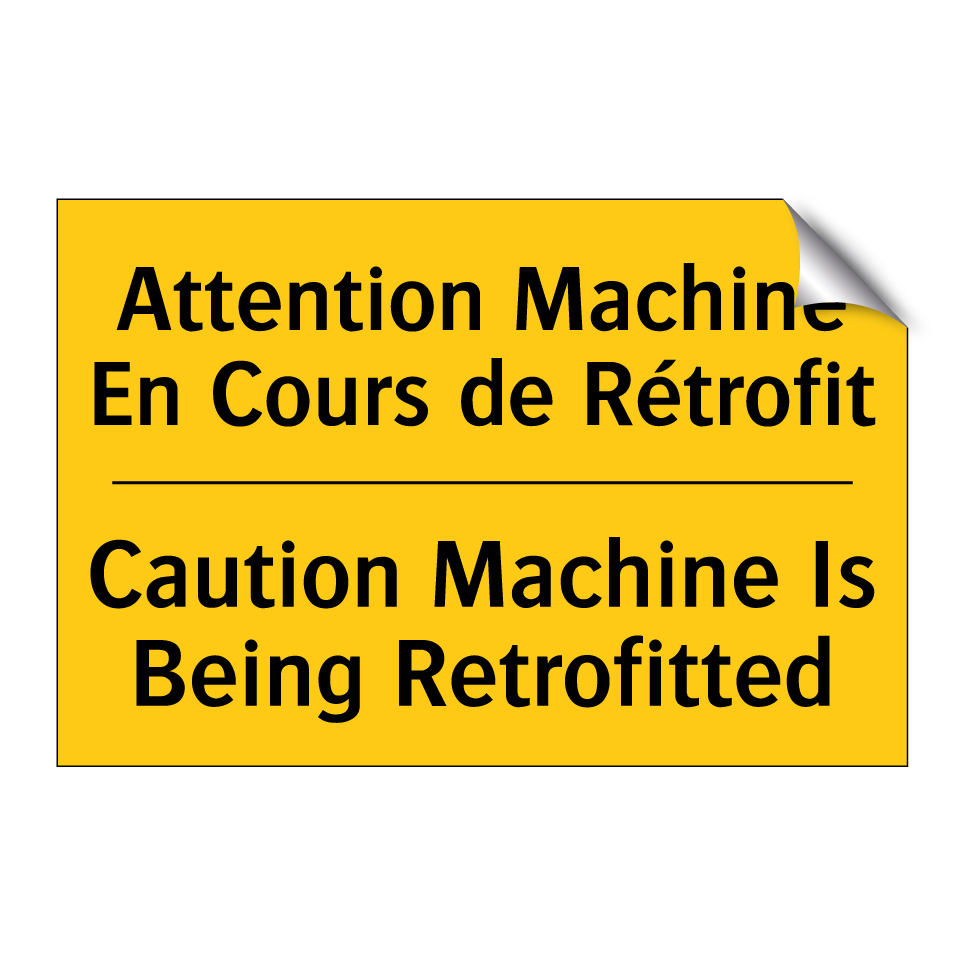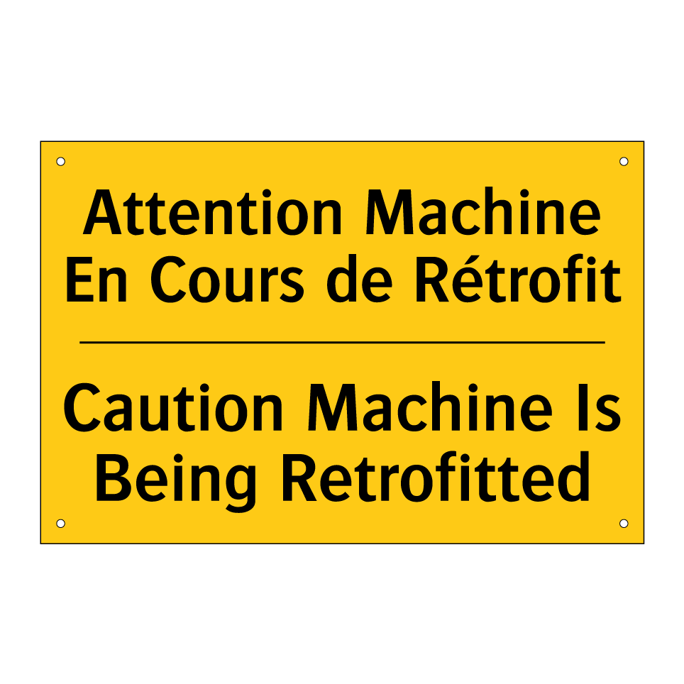 Panneau d'avertissement bilingue avec texte en français : "Attention Machine En Cours de Rétrofit", et en anglais : "Caution Machine Is Being Retrofitted"