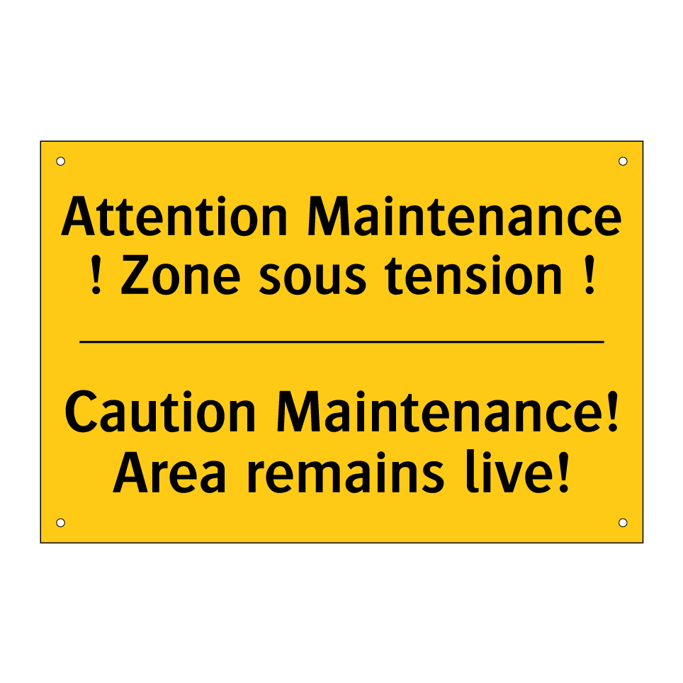 Panneau d'avertissement bilingue avec texte en français : "Attention Maintenance ! Zone sous tension !", et en anglais : "Caution Maintenance! Area remains live!"