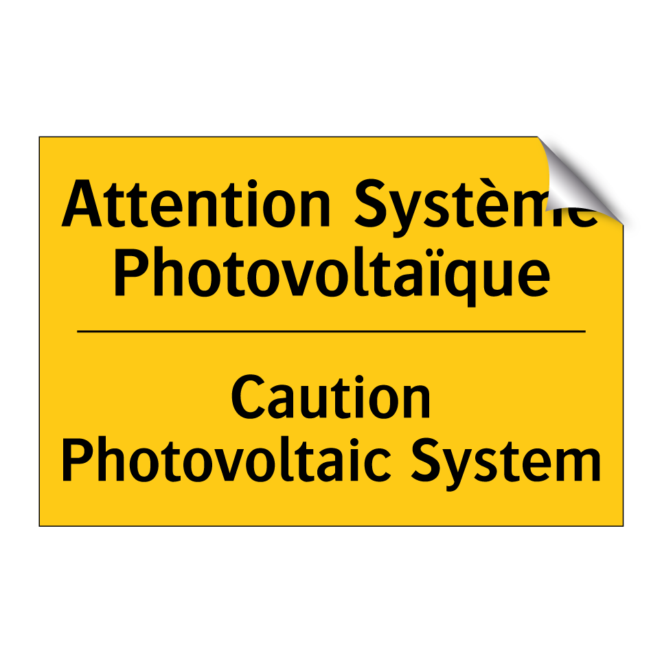 Panneau d'avertissement bilingue avec texte en français : "Attention Système Photovoltaïque", et en anglais : "Caution Photovoltaic System"