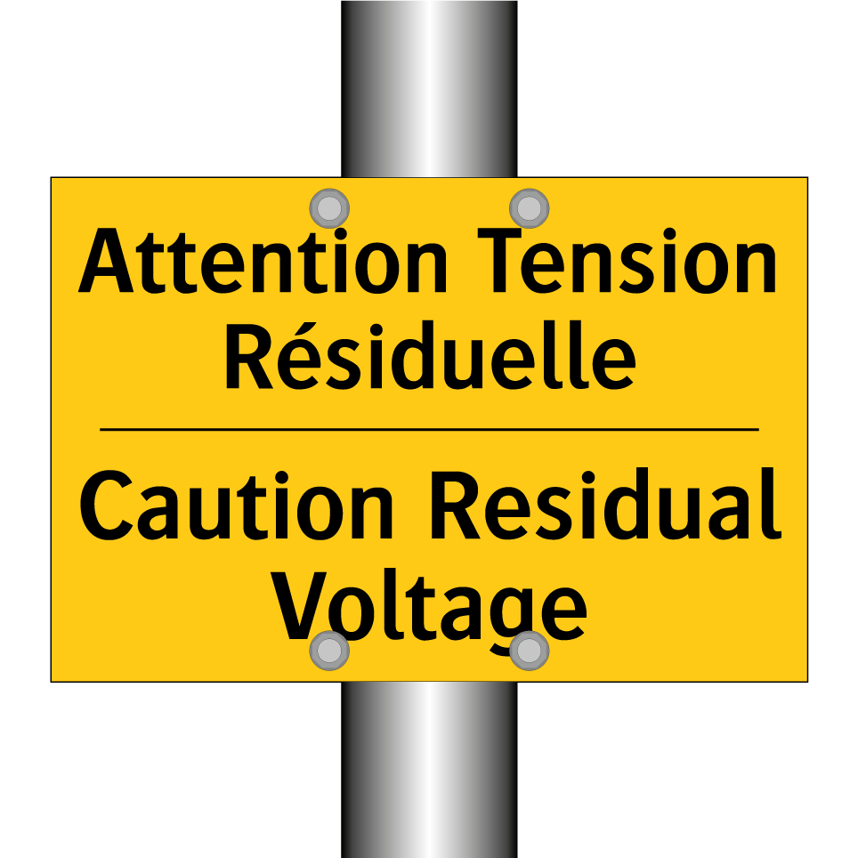 Panneau d'avertissement bilingue avec texte en français : "Attention Tension Résiduelle", et en anglais : "Caution Residual Voltage"
