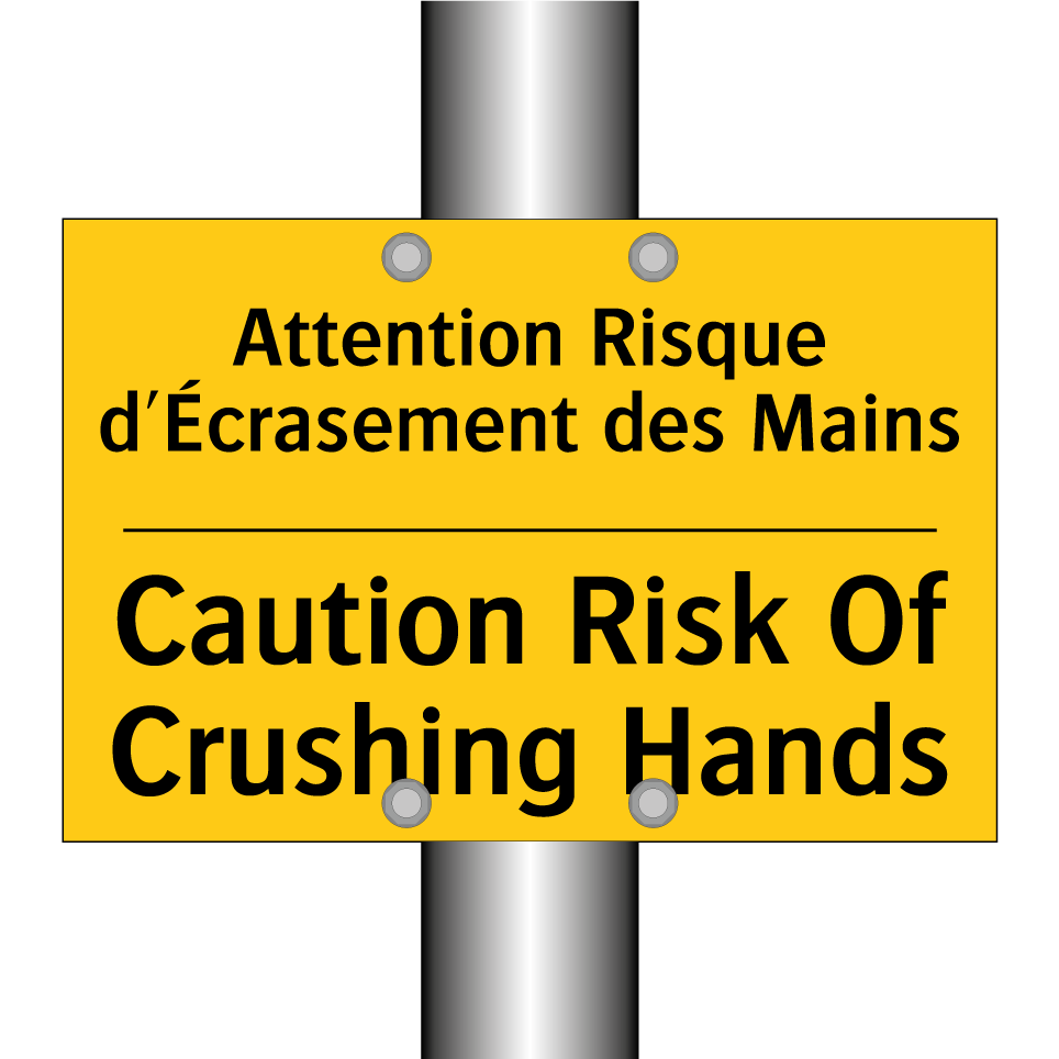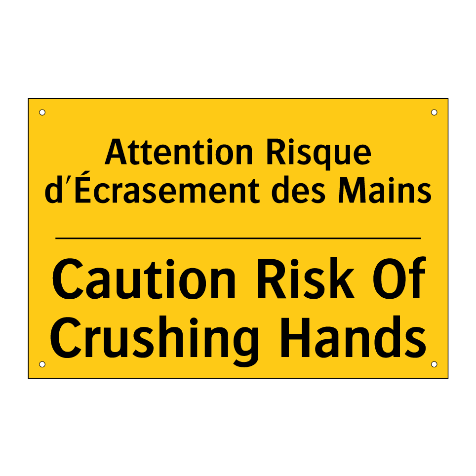 Panneau d'avertissement bilingue avec texte en français : "Attention Risque d'Écrasement des Mains", et en anglais : "Caution Risk Of Crushing Hands"