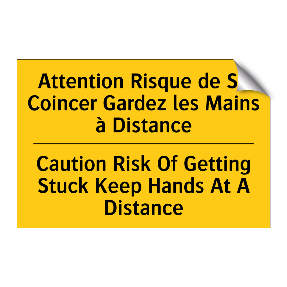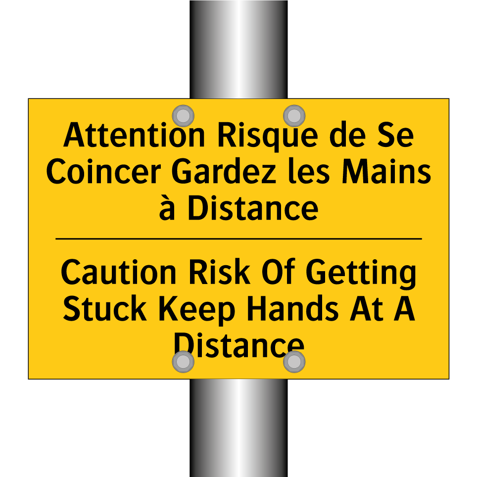 Panneau d'avertissement bilingue avec texte en français : "Attention Risque de Se Coincer Gardez les Mains à Distance", et en anglais : "Caution Risk Of Getting Stuck Keep Hands At A Distance"