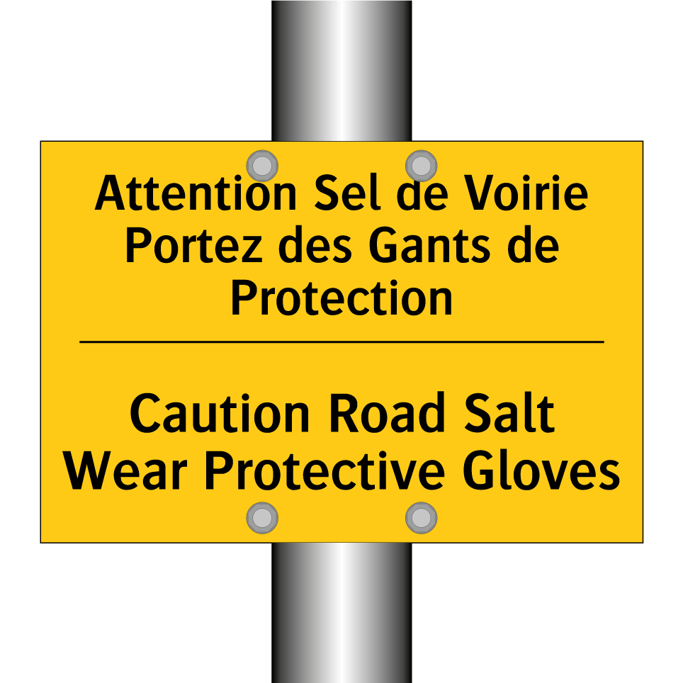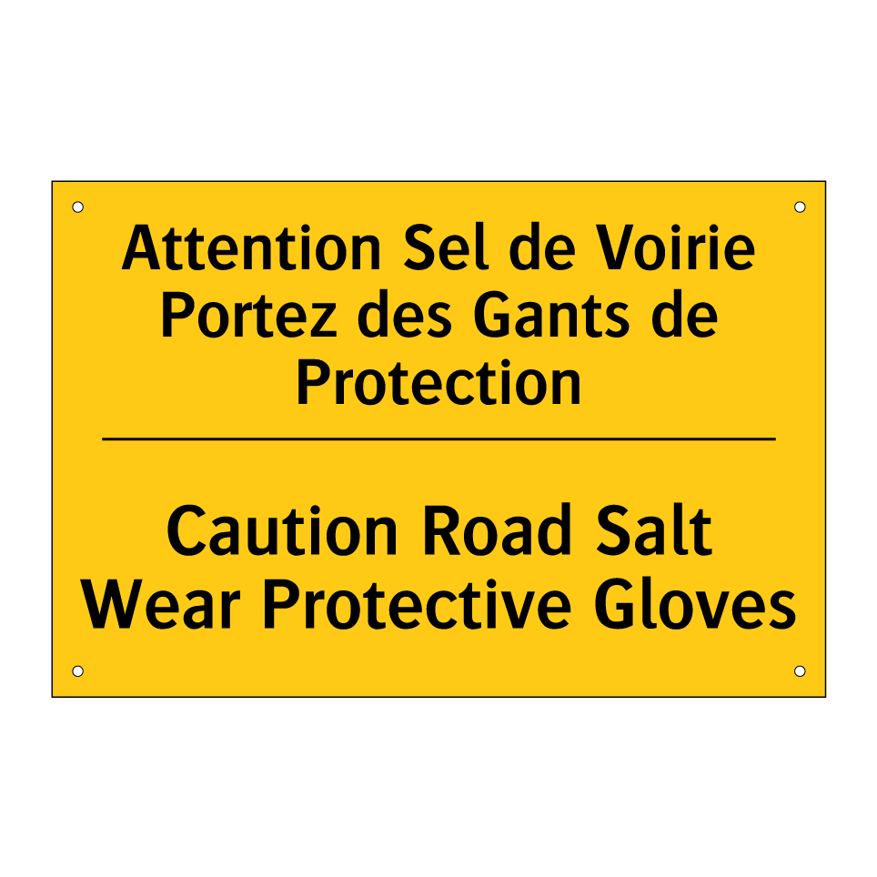 Panneau d'avertissement bilingue avec texte en français : "Attention Sel de Voirie Portez des Gants de Protection", et en anglais : "Caution Road Salt Wear Protective Gloves"