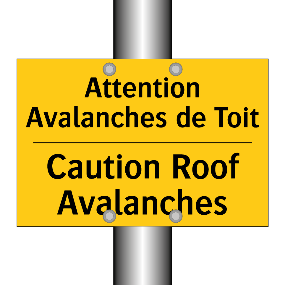 Panneau d'avertissement bilingue avec texte en français : "Attention Avalanches de Toit", et en anglais : "Caution Roof Avalanches"