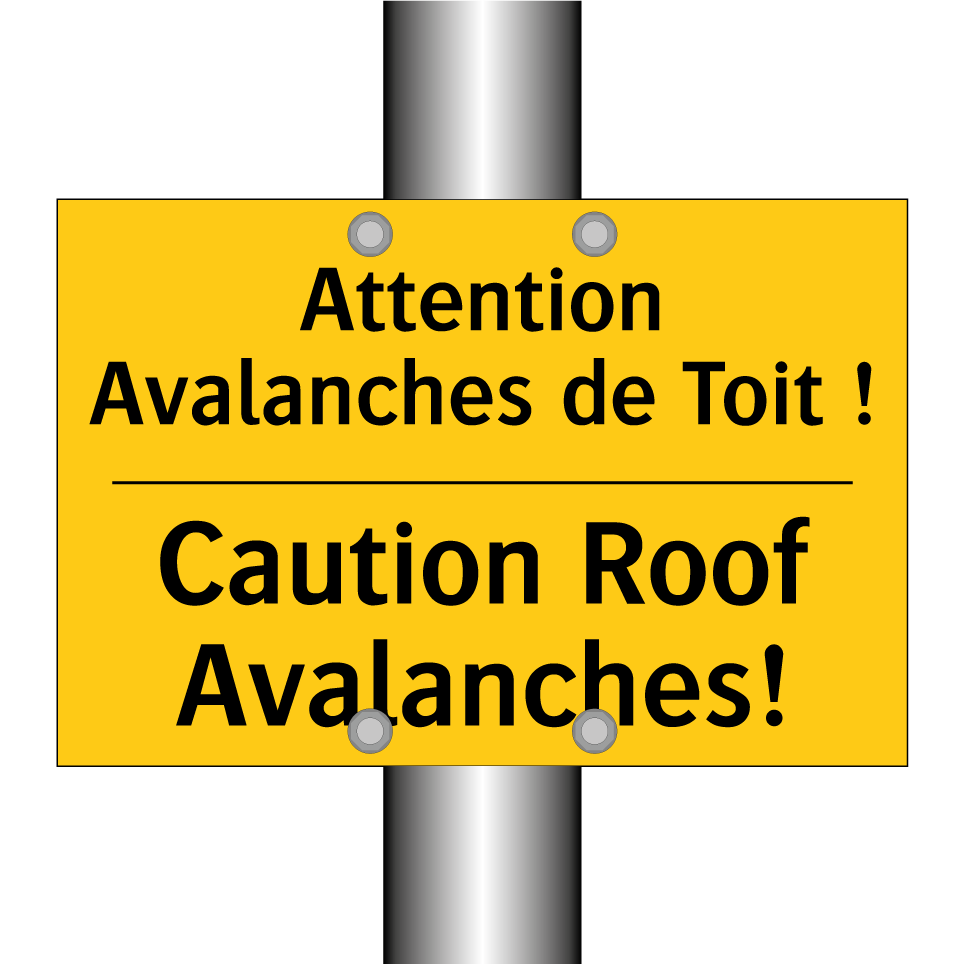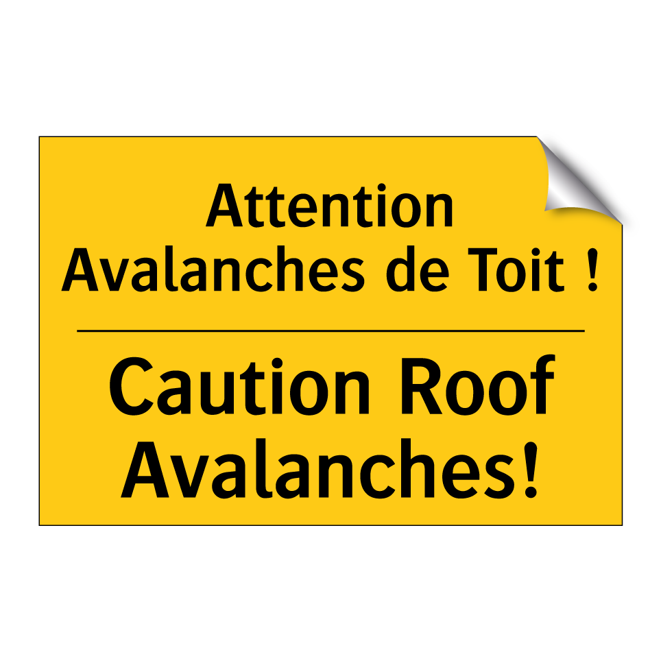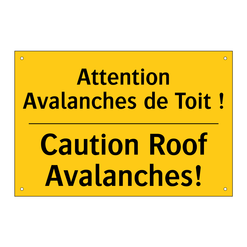 Panneau d'avertissement bilingue avec texte en français : "Attention Avalanches de Toit !", et en anglais : "Caution Roof Avalanches!"