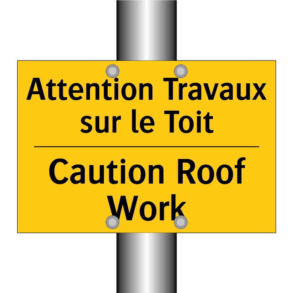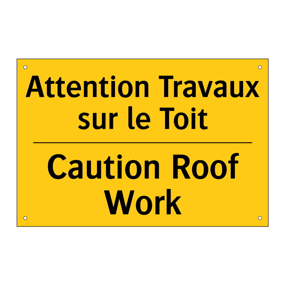 Panneau d'avertissement bilingue avec texte en français : "Attention Travaux sur le Toit", et en anglais : "Caution Roof Work"