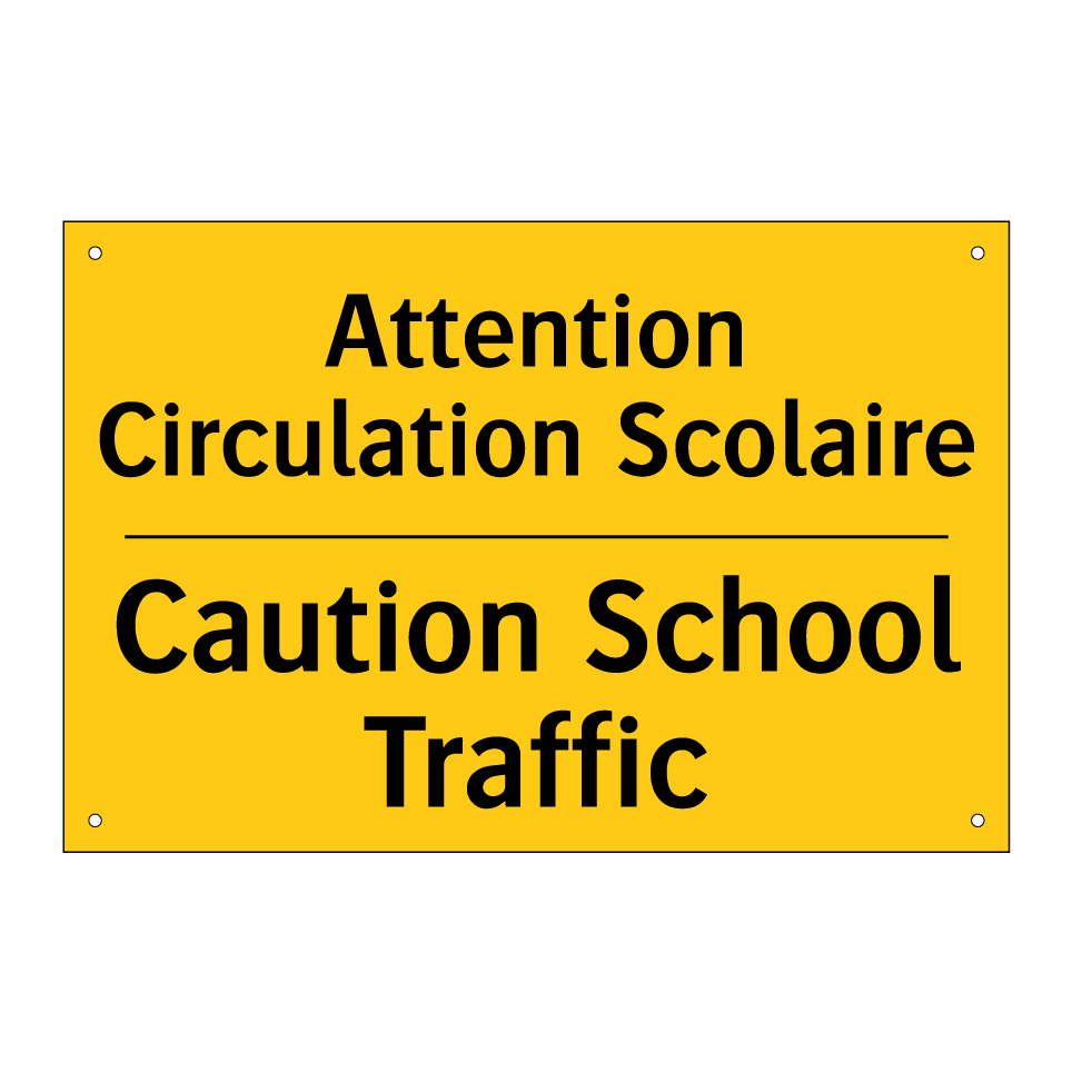 Panneau d'avertissement bilingue avec texte en français : "Attention Circulation Scolaire", et en anglais : "Caution School Traffic"