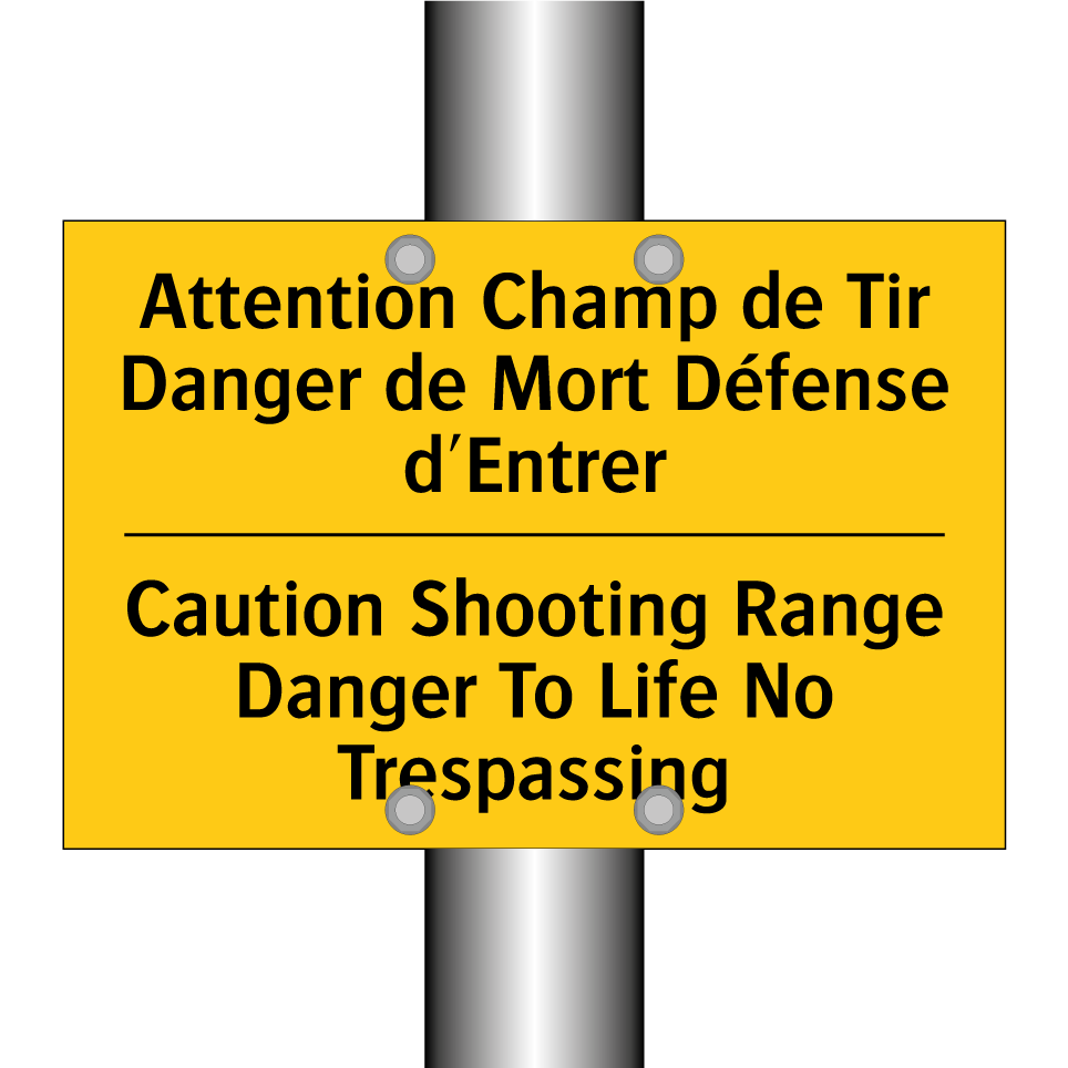 Panneau d'avertissement bilingue avec texte en français : "Attention Champ de Tir Danger de Mort Défense d'Entrer", et en anglais : "Caution Shooting Range Danger To Life No Trespassing"