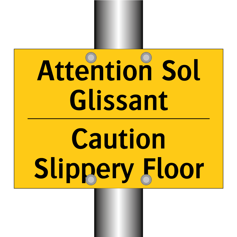 Panneau d'avertissement bilingue avec texte en français : "Attention Sol Glissant", et en anglais : "Caution Slippery Floor"