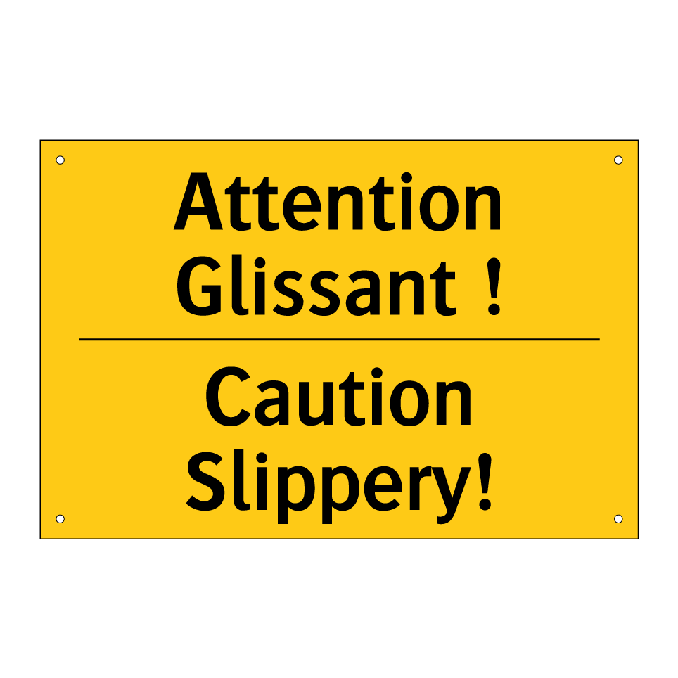 Panneau d'avertissement bilingue avec texte en français : "Attention Glissant !", et en anglais : "Caution Slippery!"