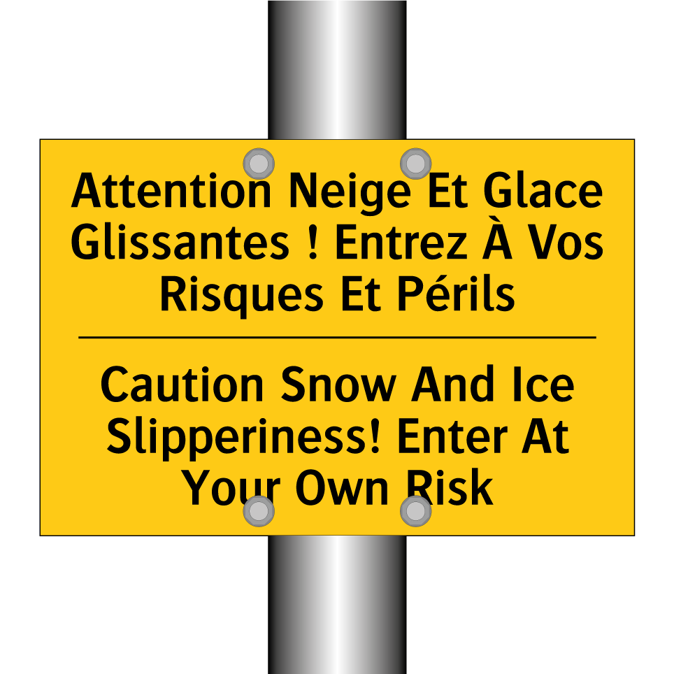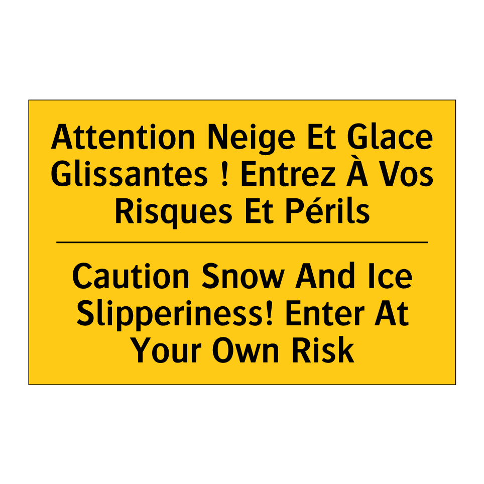 Panneau d'avertissement bilingue avec texte en français : "Attention Neige Et Glace Glissantes ! Entrez À Vos Risques Et Périls", et en anglais : "Caution Snow And Ice Slipperiness! Enter At Your Own Risk"