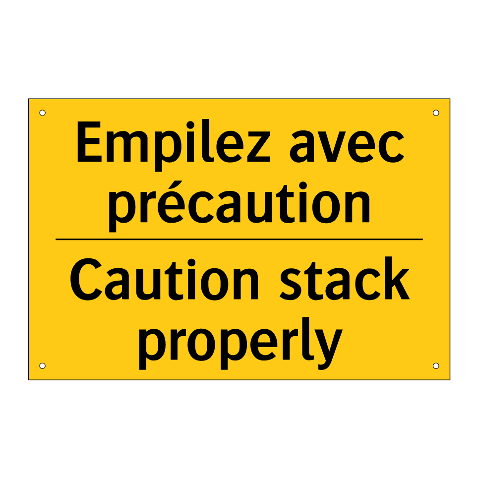 Panneau d'avertissement bilingue avec texte en français : "Empilez avec précaution", et en anglais : "Caution stack properly"