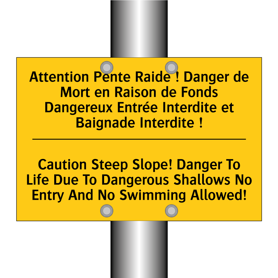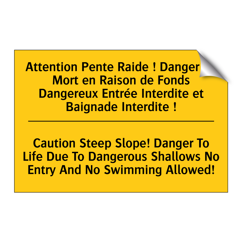 Panneau d'avertissement bilingue avec texte en français : "Attention Pente Raide ! Danger de Mort en Raison de Fonds Dangereux Entrée Interdite et Baignade Interdite !", et en anglais : "Caution Steep Slope! Danger To Life Due To Dangerous Shallows No Entry And No Swimming Allowed!"