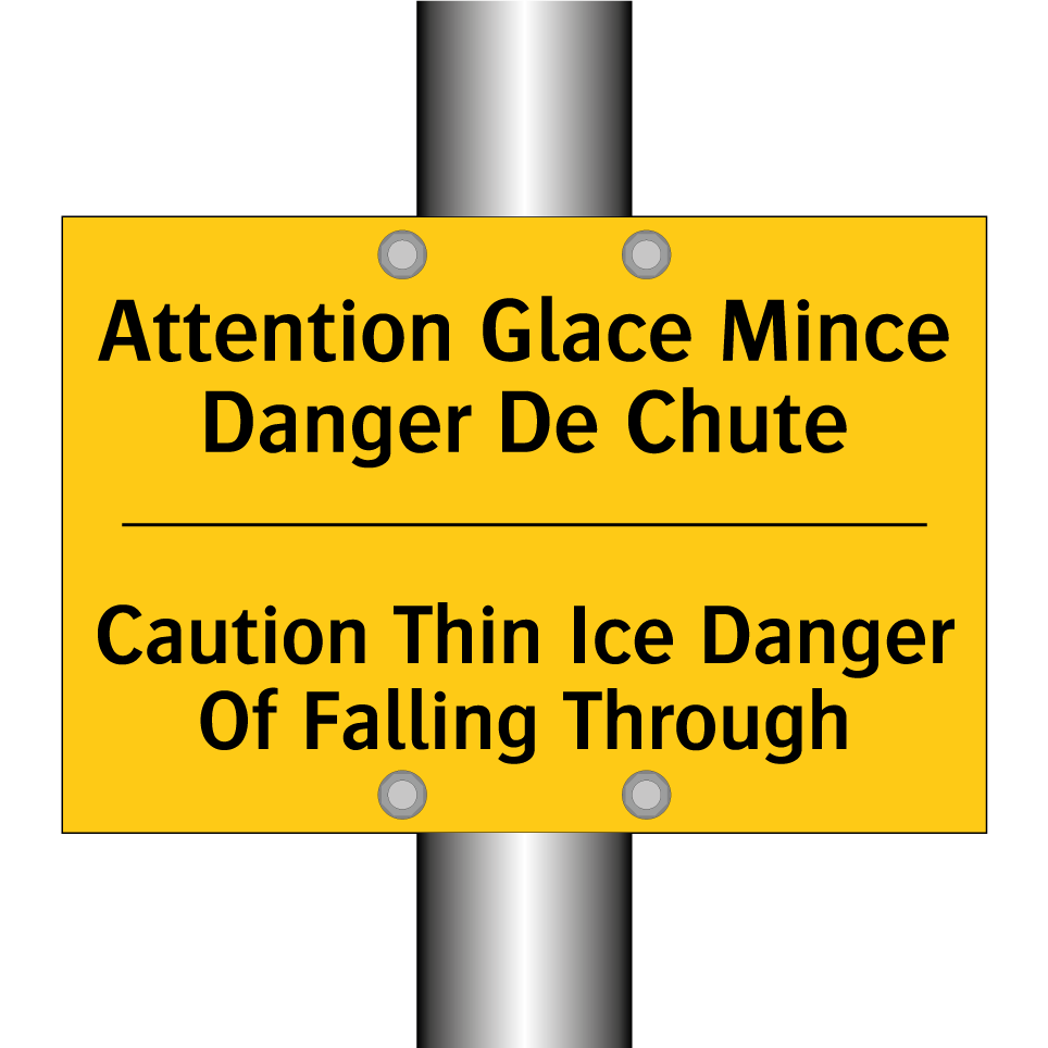 Panneau d'avertissement bilingue avec texte en français : "Attention Glace Mince Danger De Chute", et en anglais : "Caution Thin Ice Danger Of Falling Through"