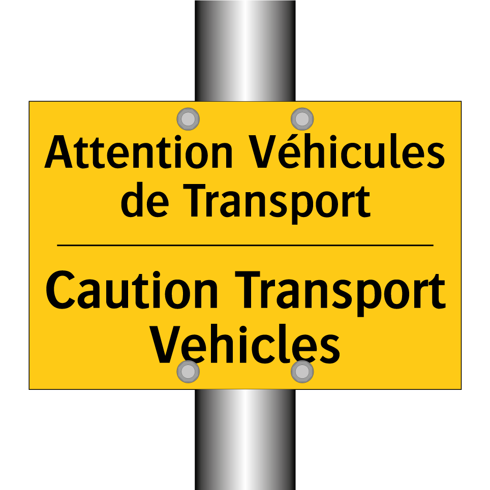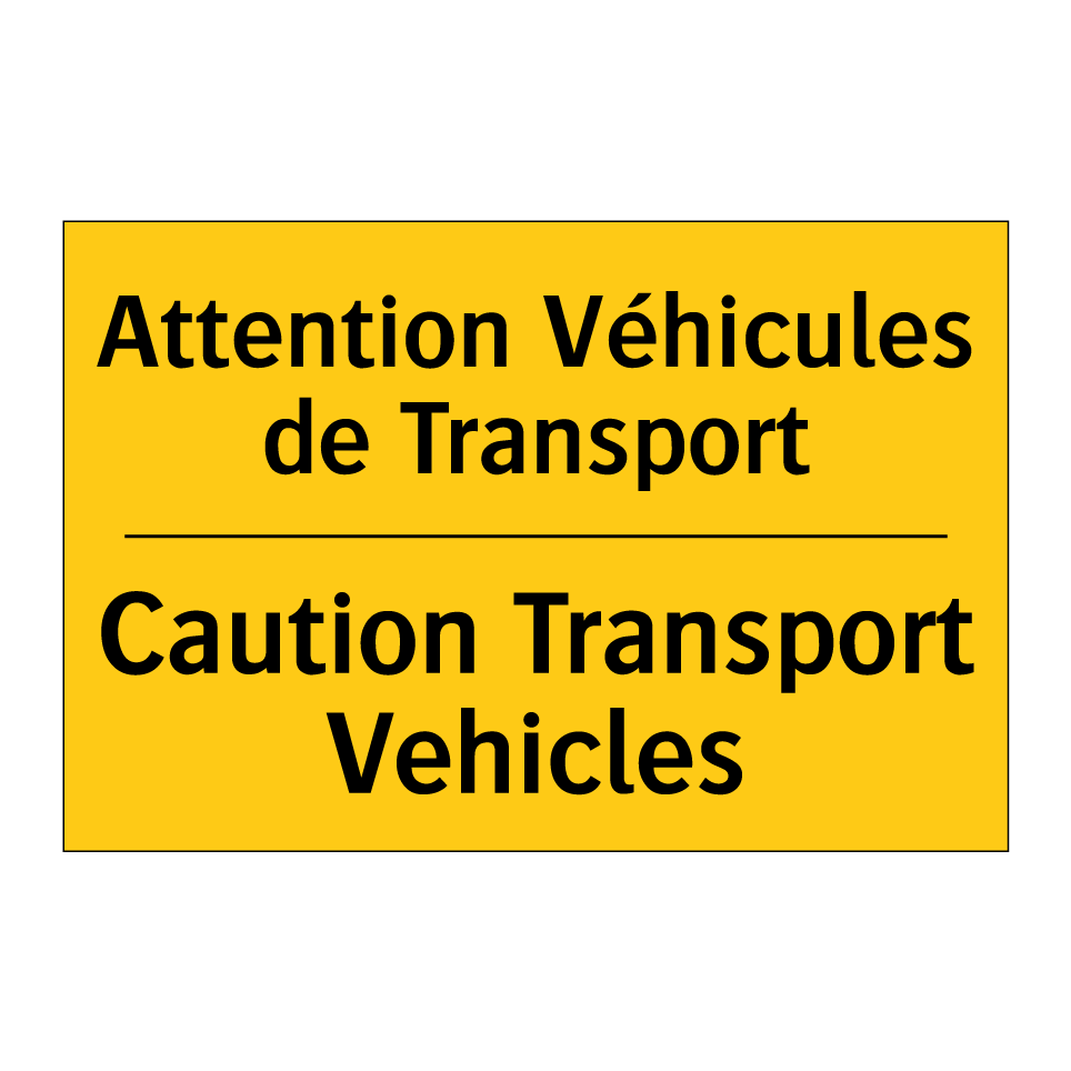 Panneau d'avertissement bilingue avec texte en français : "Attention Véhicules de Transport", et en anglais : "Caution Transport Vehicles"
