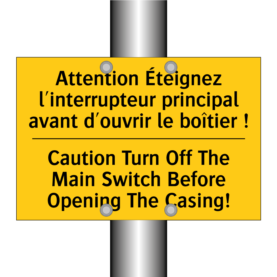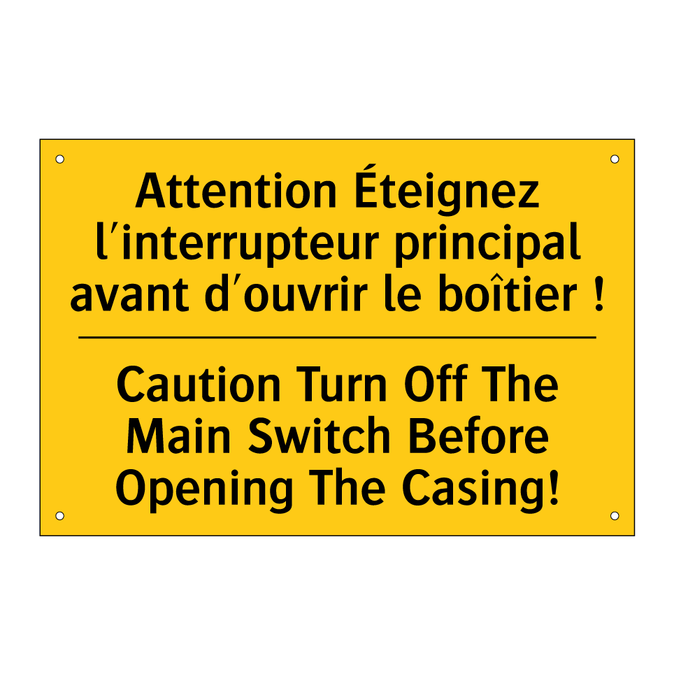 Panneau d'avertissement bilingue avec texte en français : "Attention Éteignez l'interrupteur principal avant d'ouvrir le boîtier !", et en anglais : "Caution Turn Off The Main Switch Before Opening The Casing!"