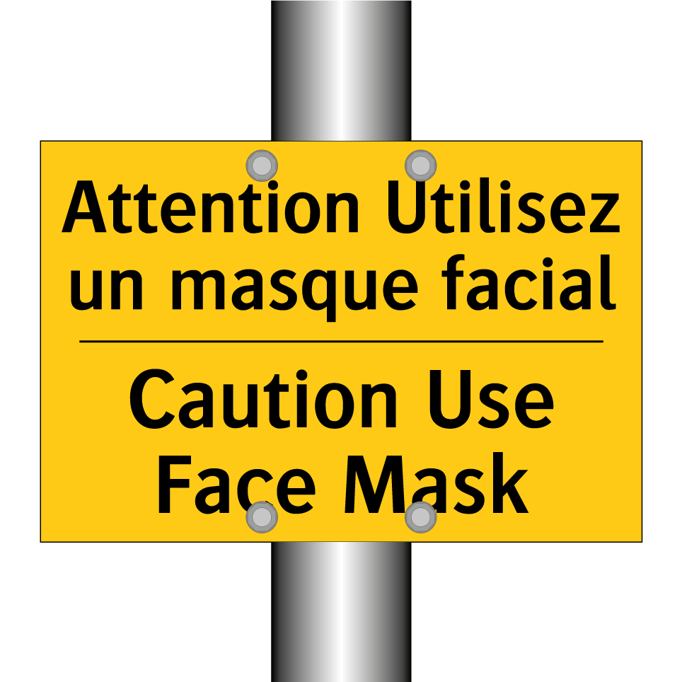 Panneau d'avertissement bilingue avec texte en français : "Attention Utilisez un masque facial", et en anglais : "Caution Use Face Mask"