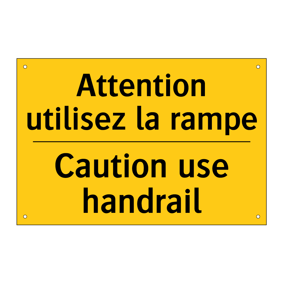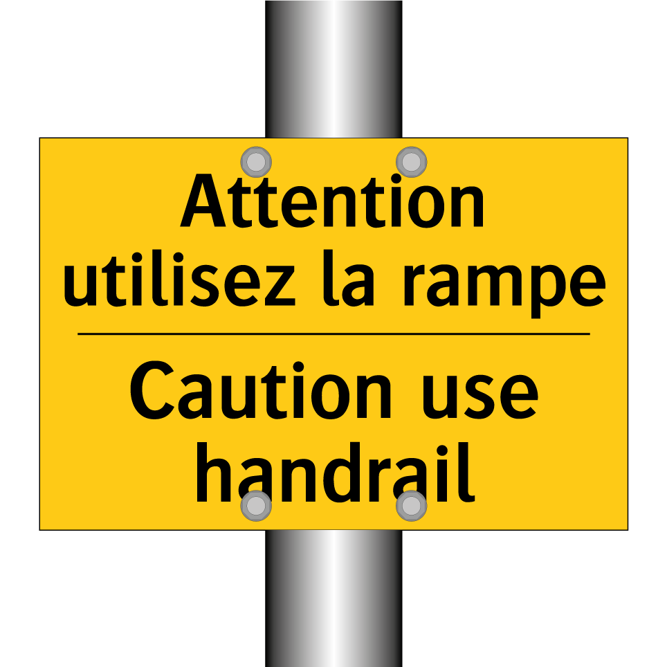 Panneau d'avertissement bilingue avec texte en français : "Attention utilisez la rampe", et en anglais : "Caution use handrail"