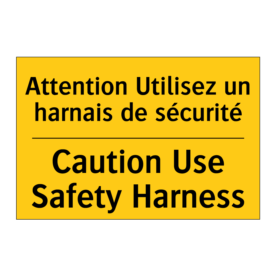 Panneau d'avertissement bilingue avec texte en français : "Attention Utilisez un harnais de sécurité", et en anglais : "Caution Use Safety Harness"
