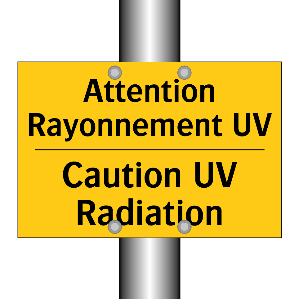 Panneau d'avertissement bilingue avec texte en français : "Attention Rayonnement UV", et en anglais : "Caution UV Radiation"
