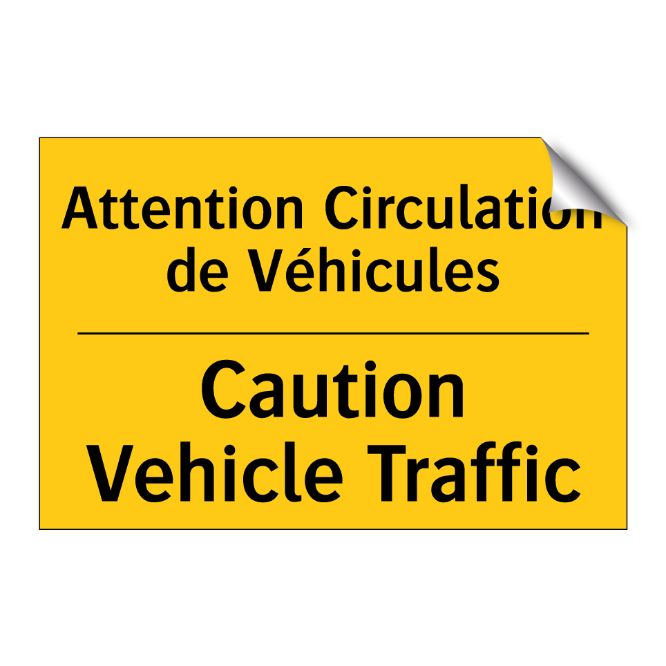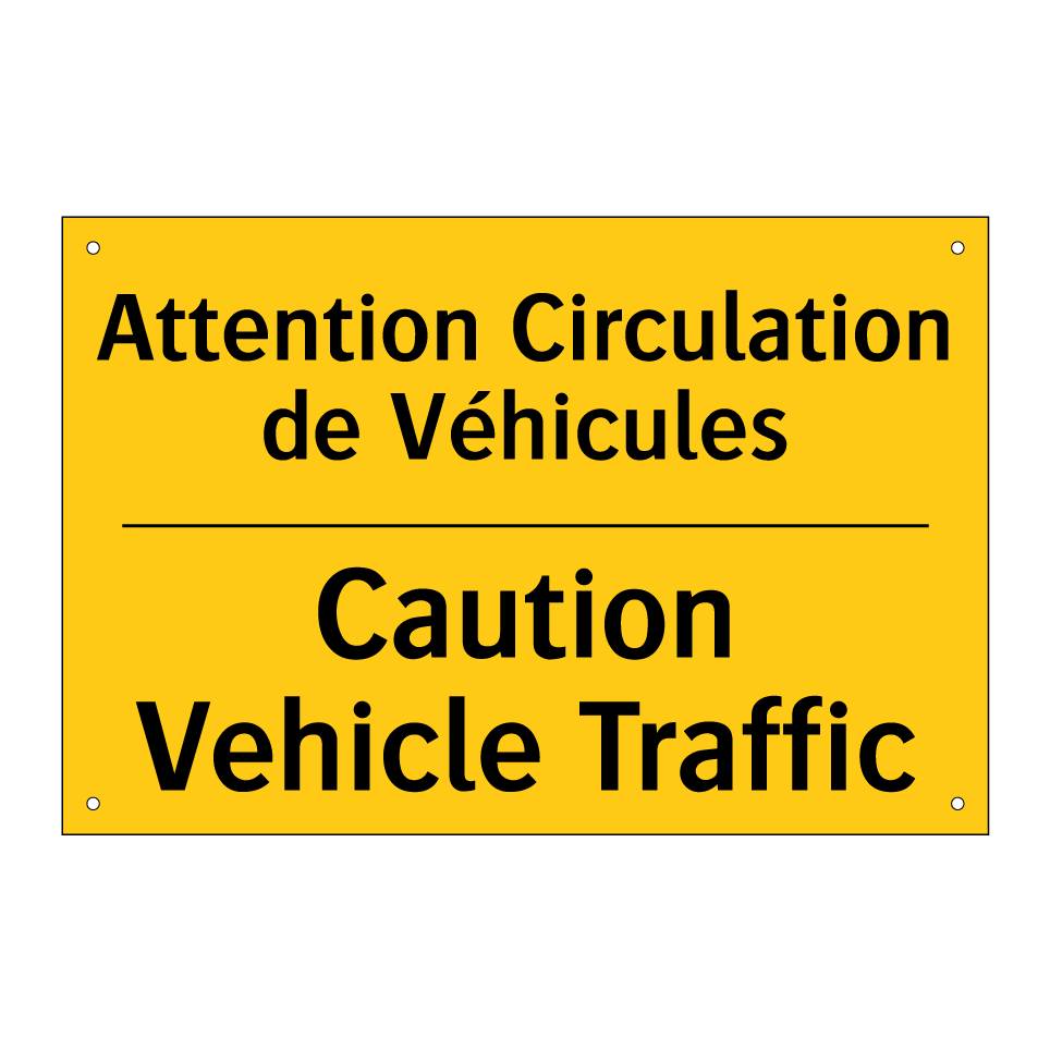 Panneau d'avertissement bilingue avec texte en français : "Attention Circulation de Véhicules", et en anglais : "Caution Vehicle Traffic"