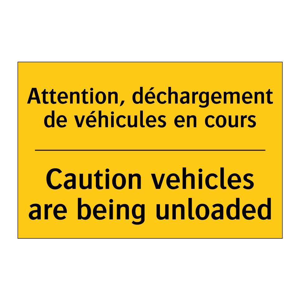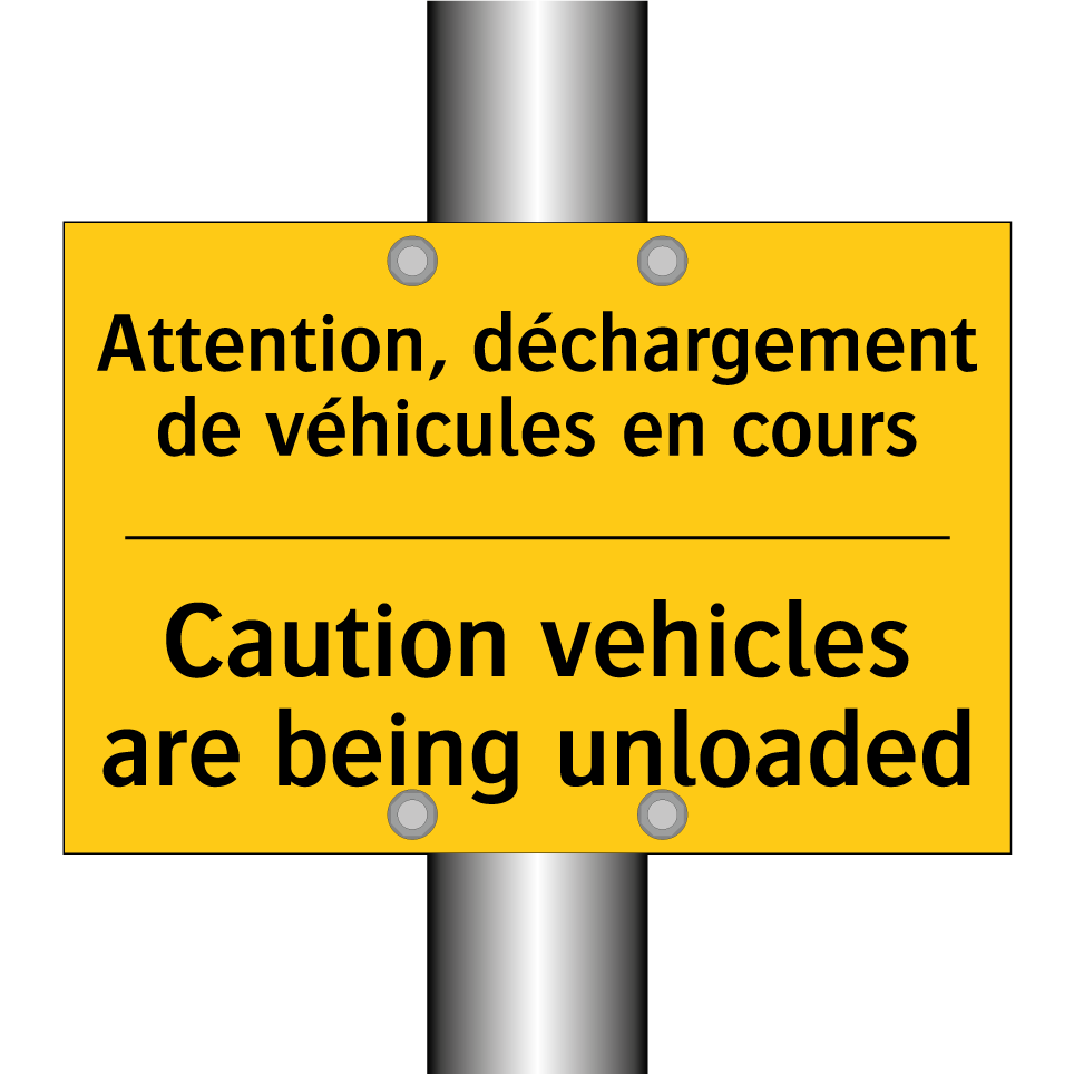 Panneau d'avertissement bilingue avec texte en français : "Attention, déchargement de véhicules en cours", et en anglais : "Caution vehicles are being unloaded"