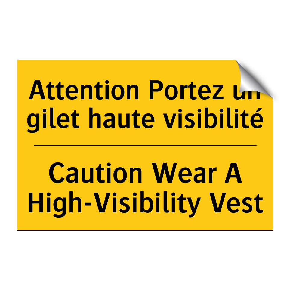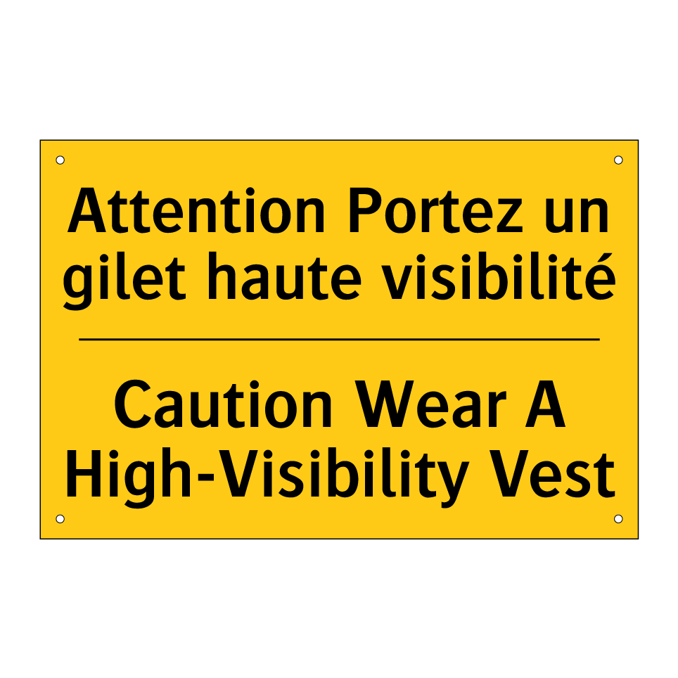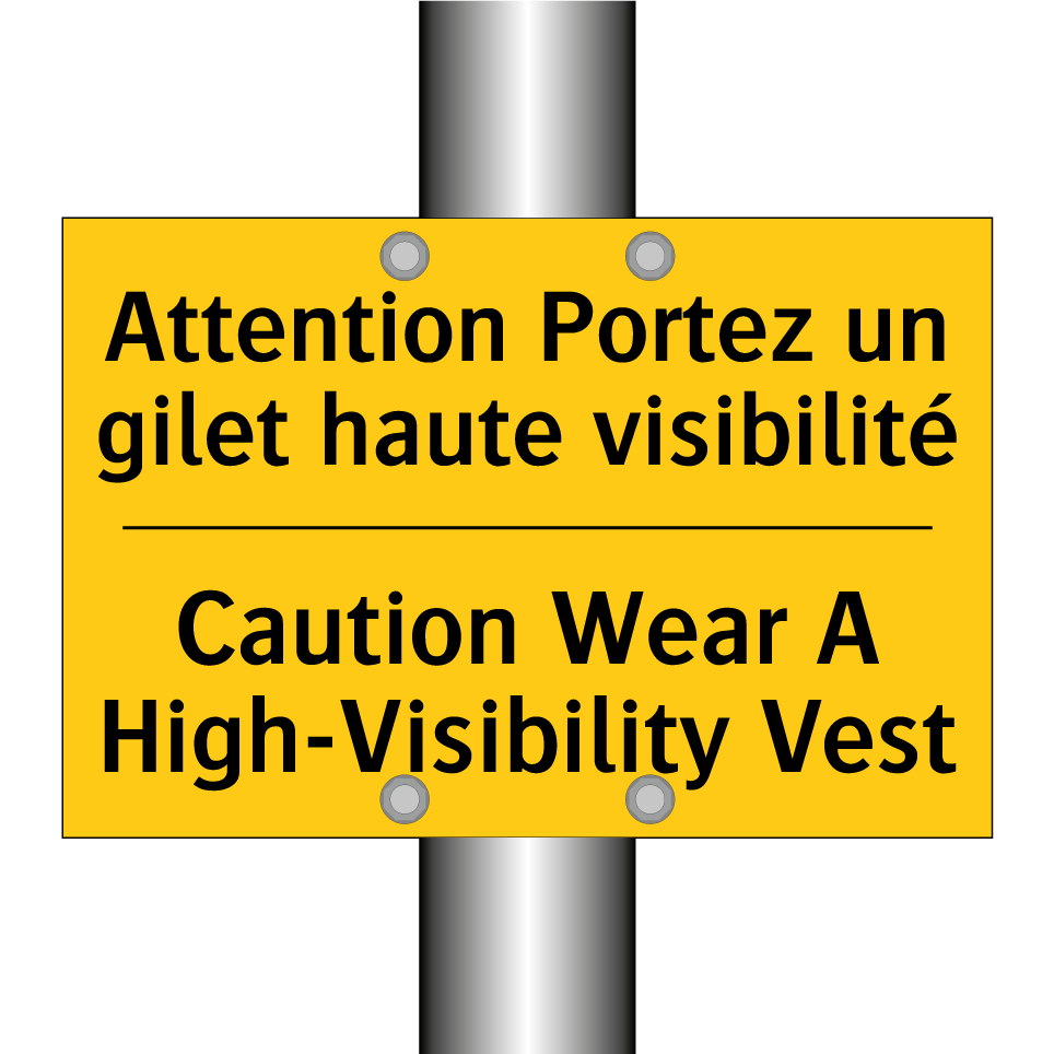 Panneau d'avertissement bilingue avec texte en français : "Attention Portez un gilet haute visibilité", et en anglais : "Caution Wear A High-Visibility Vest"