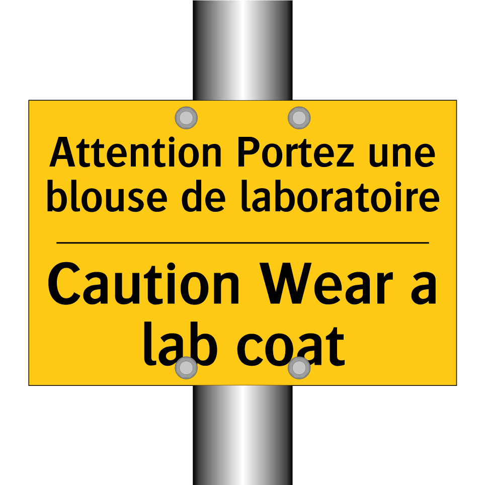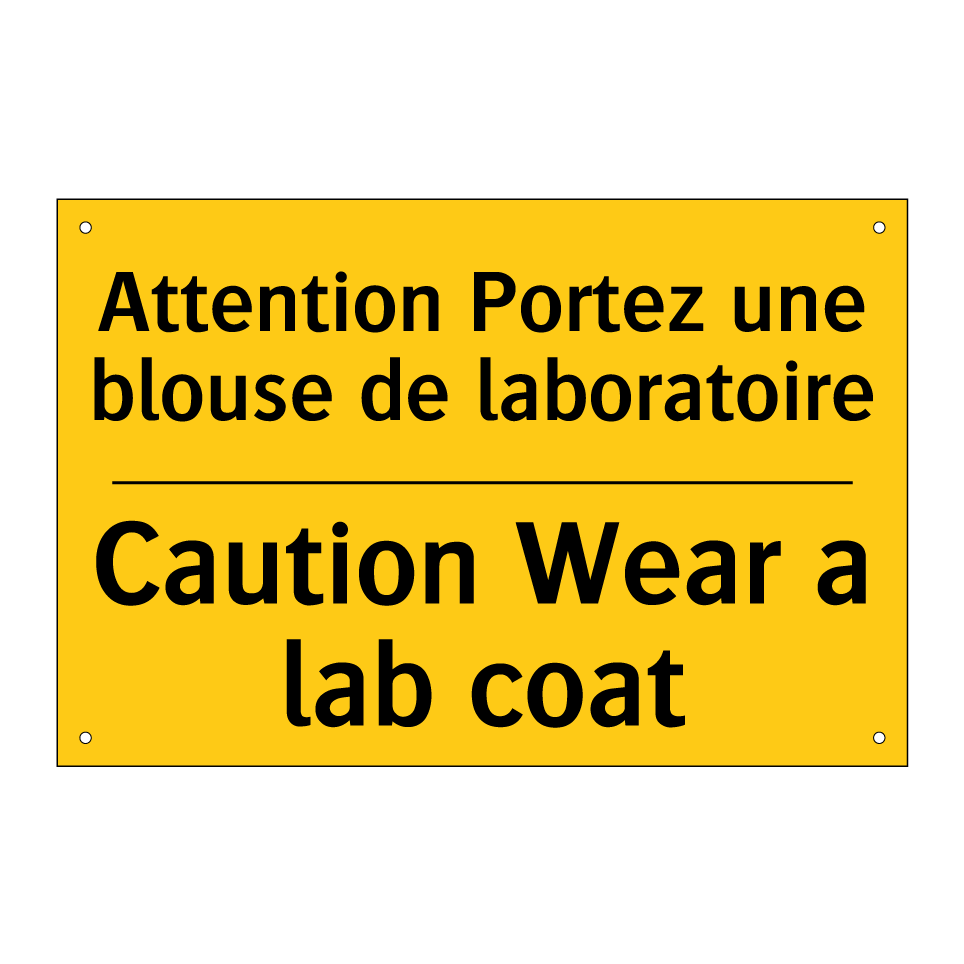 Panneau d'avertissement bilingue avec texte en français : "Attention Portez une blouse de laboratoire", et en anglais : "Caution Wear a lab coat"
