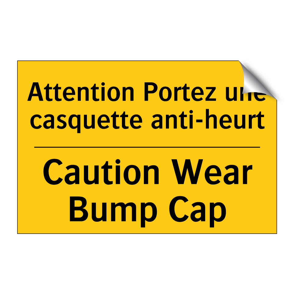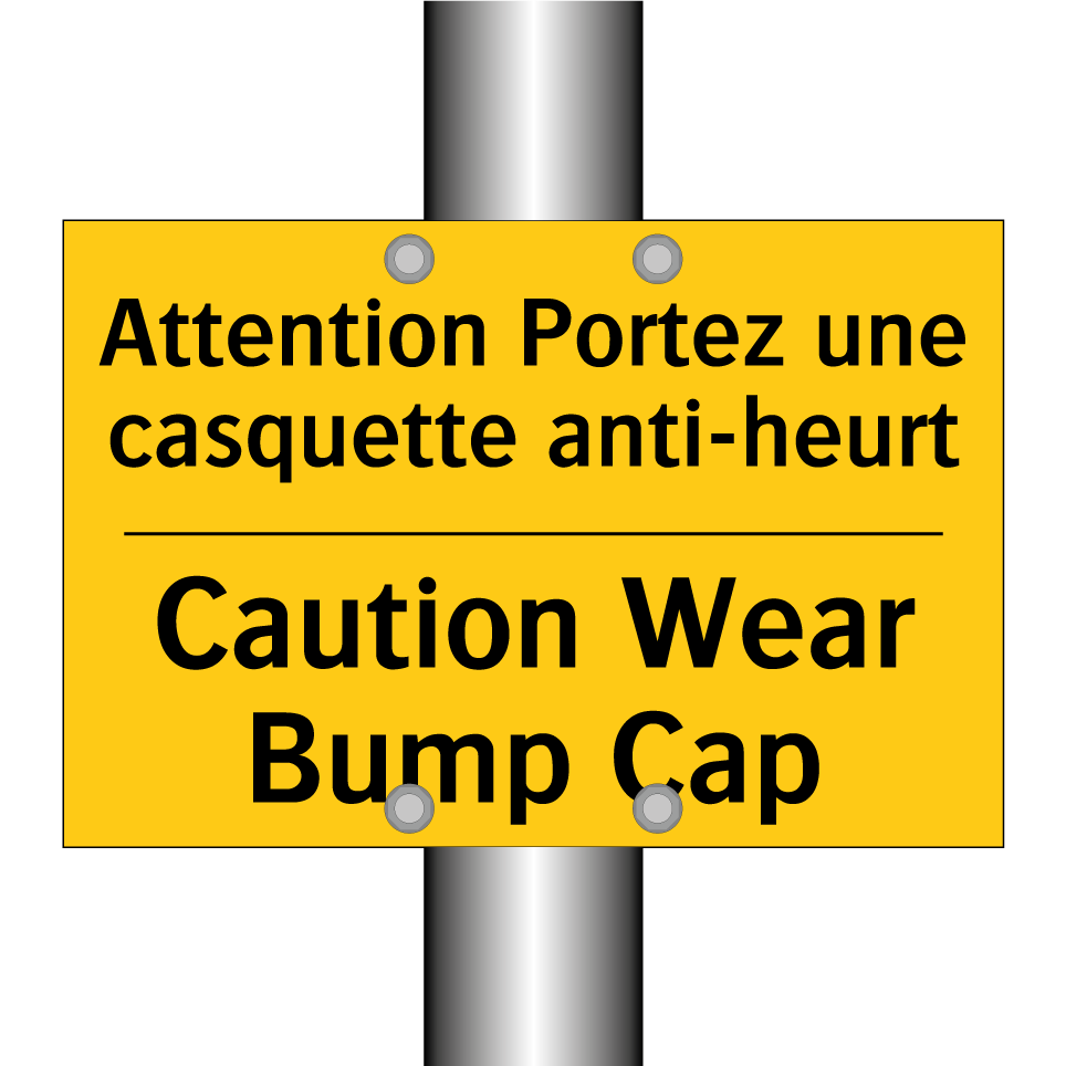 Panneau d'avertissement bilingue avec texte en français : "Attention Portez une casquette anti-heurt", et en anglais : "Caution Wear Bump Cap"